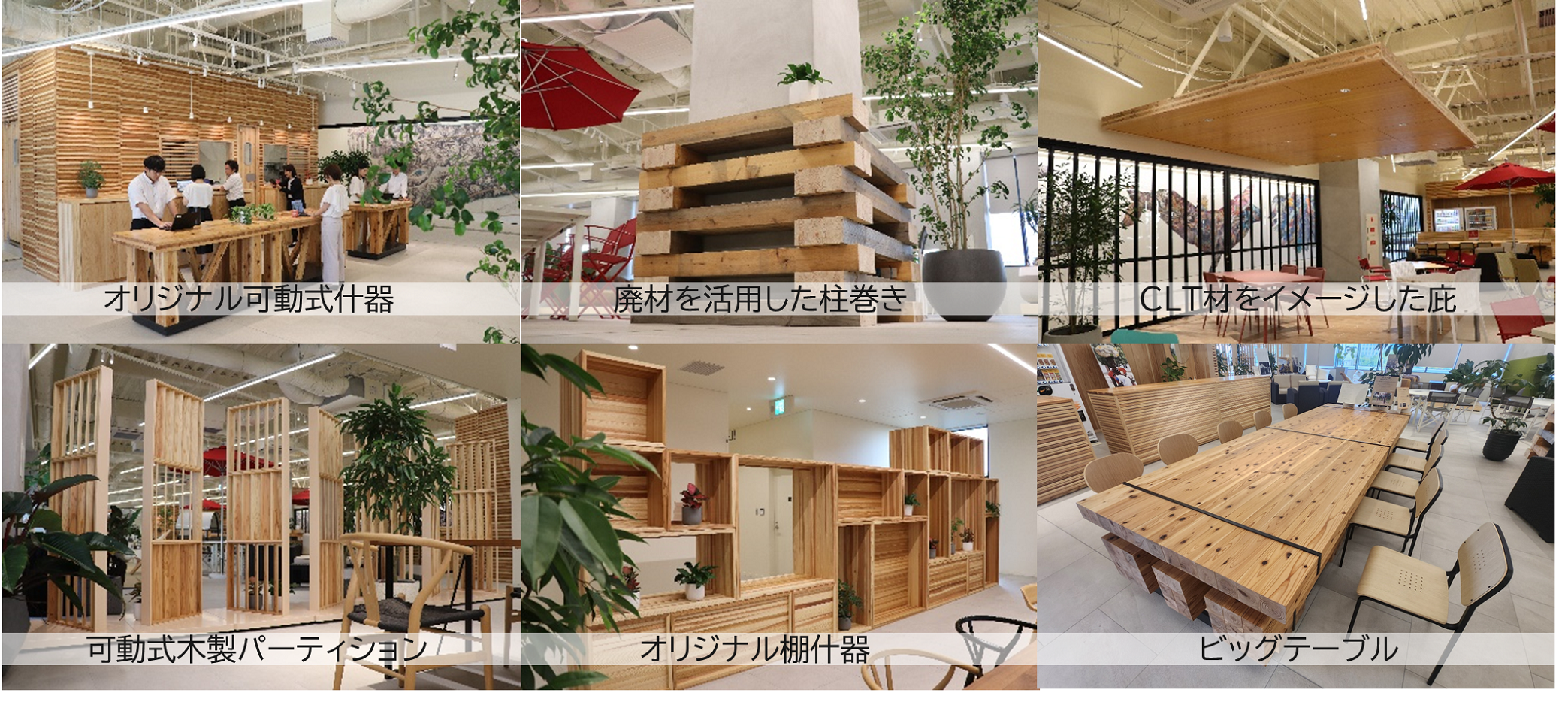「N-LOUNGE」では、株式会社乃村工藝社がデザインし、高知県仁淀川町で木材の加工や木製品の製造を行う池川木材工業有限会社によって、地元で伐採・製材・加工された国産土佐材をふんだんに活用した数々の什器を採用しました。