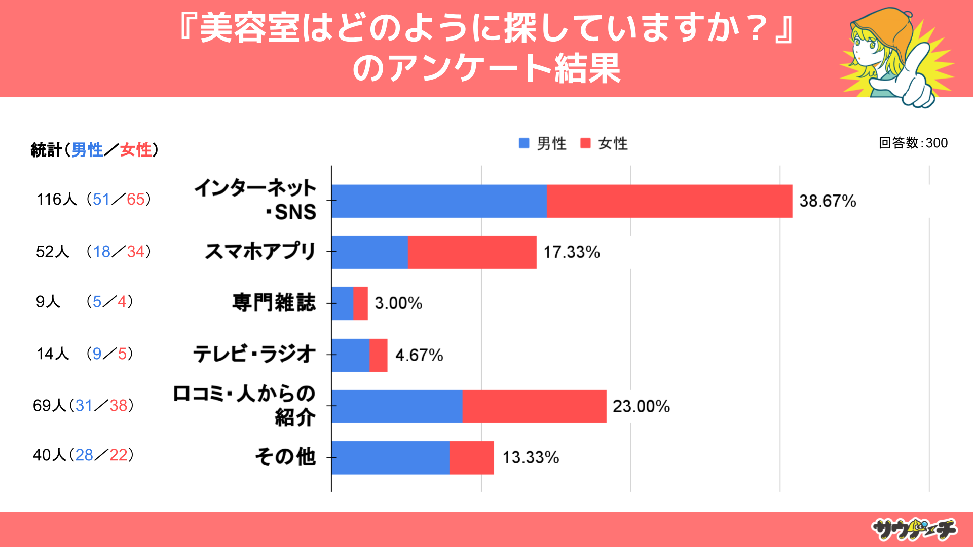 20代〜40代男女を対象とした「美容室はどのように探していますか?」というアンケートで最も多かった回答は「インターネット・SNS」で38.67%でした。