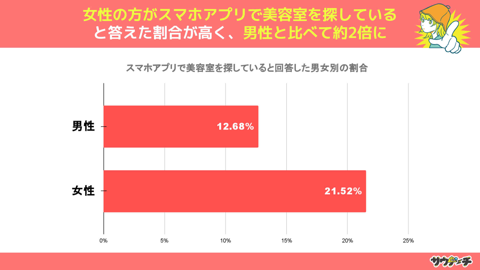 【女性の方がスマホアプリで美容室を探していると答えた割合が高く、男性と比べて約2倍に】