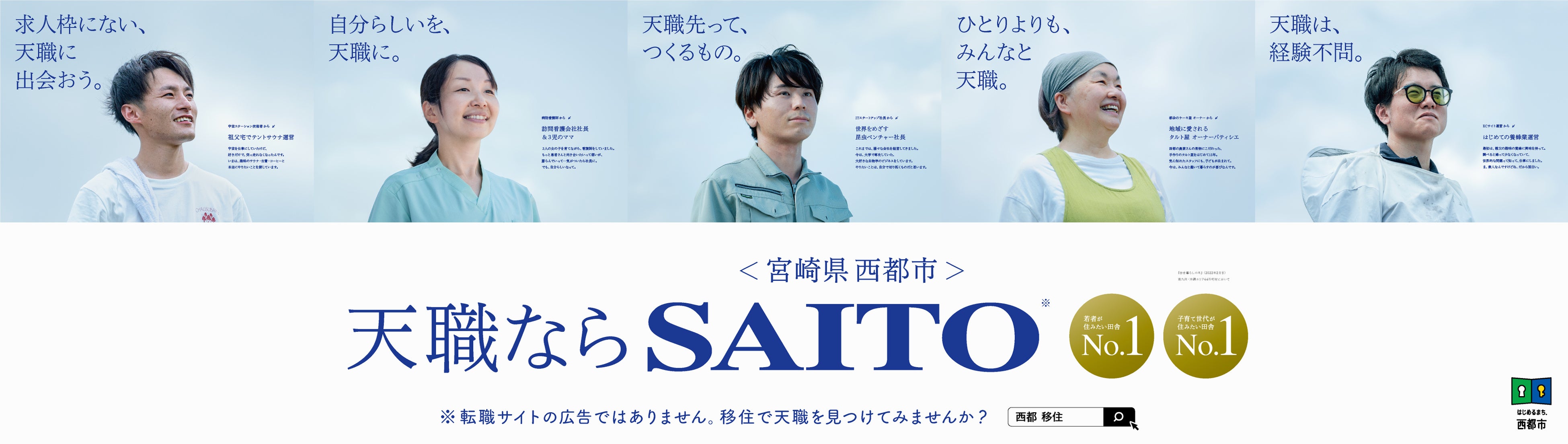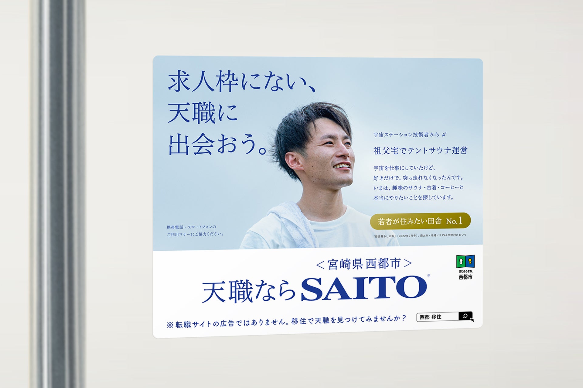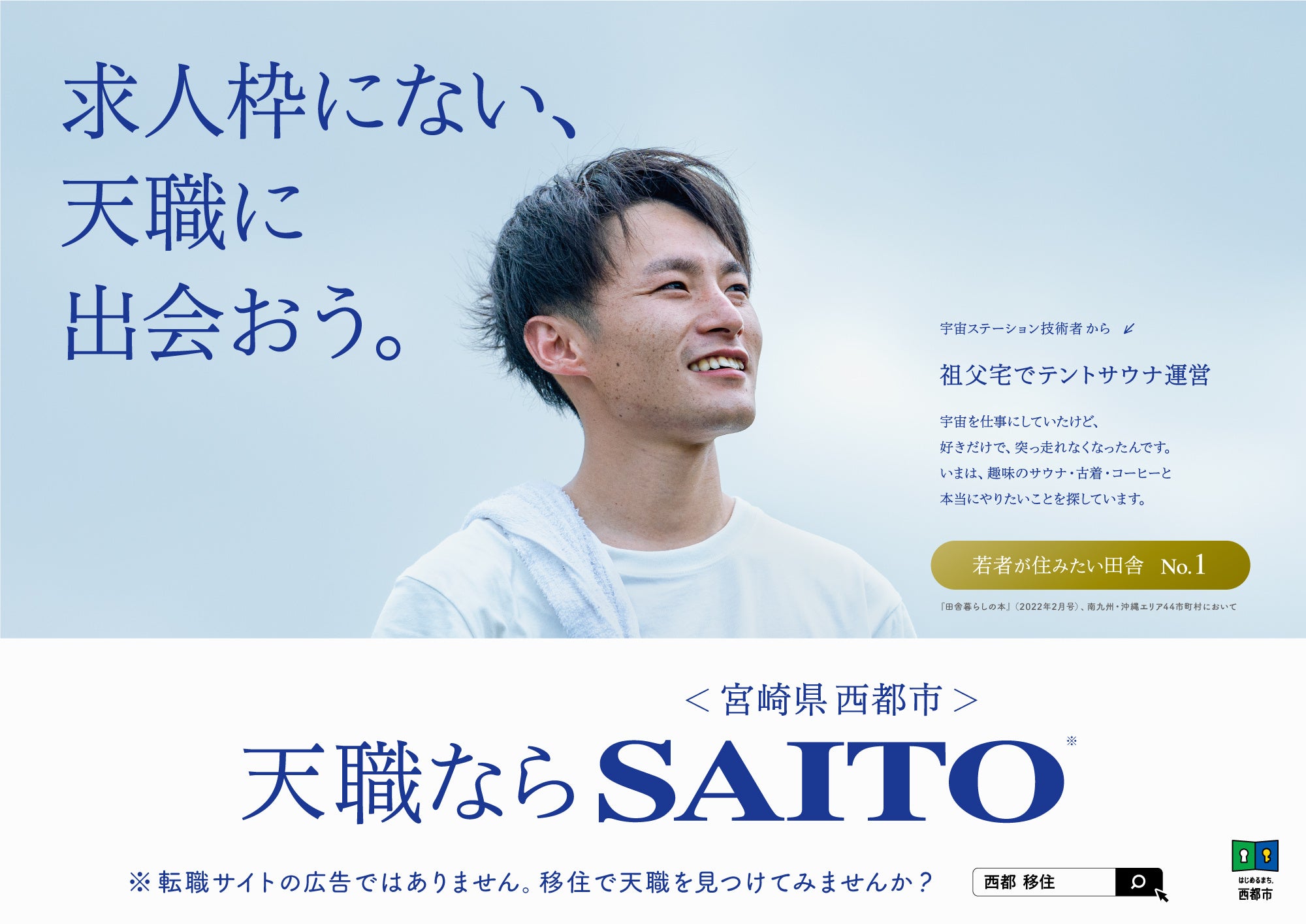 今年西都市は、若年層の認知・移住を目的に、多様な働き方やライフスタイルに合わせて、転職という選択をする若年社会人に注目。既存の求人枠から転職先を「選ぶ」のではなく、移住ならまだ見ぬ天職先を「つくれる・見つけられる」というコンセプトを開発。さらに、“天職”は一生の仕事ではなく、「いまの自分がやりたい、はじめたいこと」と考え、“天職”を西都市で見つけてほしいという想いから「天職ならSAITO」の広告を制作。本広告は、転職サイト広告風なビジュアルで「移住で天職を見つけてみませんか?」というメッセージを発信。宇宙ステーション技術者を離れテントサウナ運営をはじめた方、ITスタートアップ社長から世界をめざす昆虫ベンチャー社長になった方など、実際に西都市へ移住し、天職を見つけ、いきいきと暮らしている5名を紹介しています。