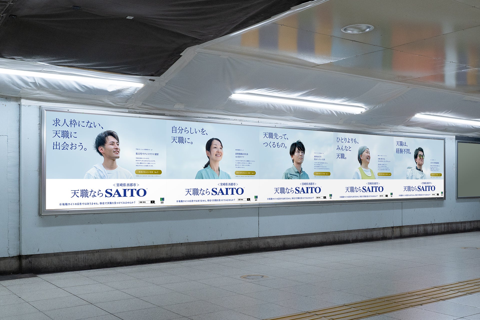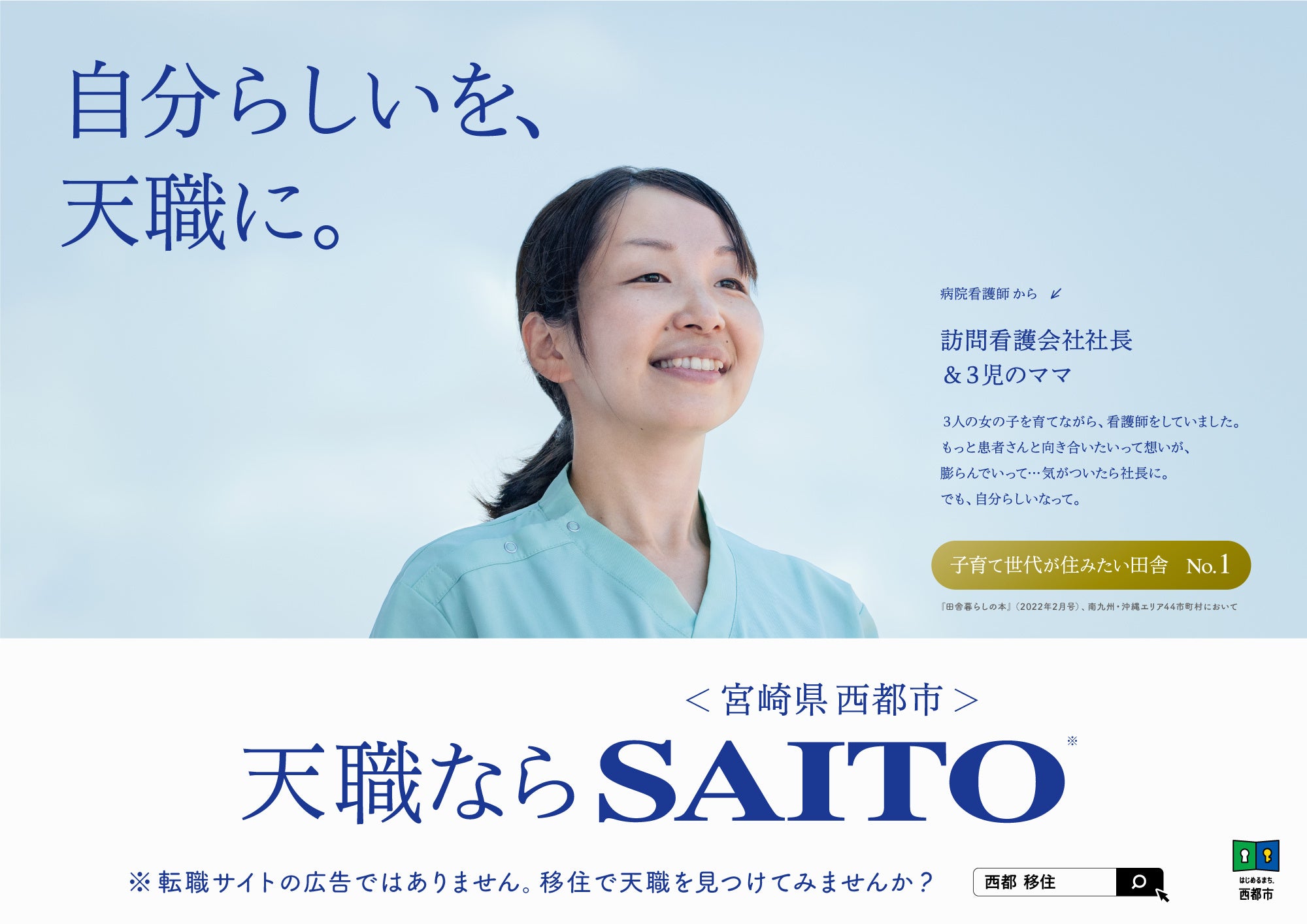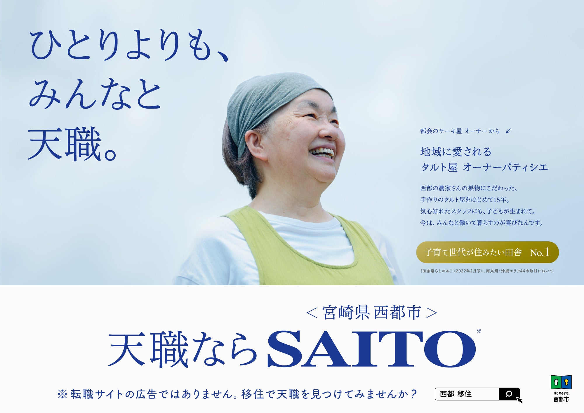 今年西都市は、若年層の認知・移住を目的に、多様な働き方やライフスタイルに合わせて、転職という選択をする若年社会人に注目。既存の求人枠から転職先を「選ぶ」のではなく、移住ならまだ見ぬ天職先を「つくれる・見つけられる」というコンセプトを開発。さらに、“天職”は一生の仕事ではなく、「いまの自分がやりたい、はじめたいこと」と考え、“天職”を西都市で見つけてほしいという想いから「天職ならSAITO」の広告を制作。本広告は、転職サイト広告風なビジュアルで「移住で天職を見つけてみませんか?」というメッセージを発信。宇宙ステーション技術者を離れテントサウナ運営をはじめた方、ITスタートアップ社長から世界をめざす昆虫ベンチャー社長になった方など、実際に西都市へ移住し、天職を見つけ、いきいきと暮らしている5名を紹介しています。
