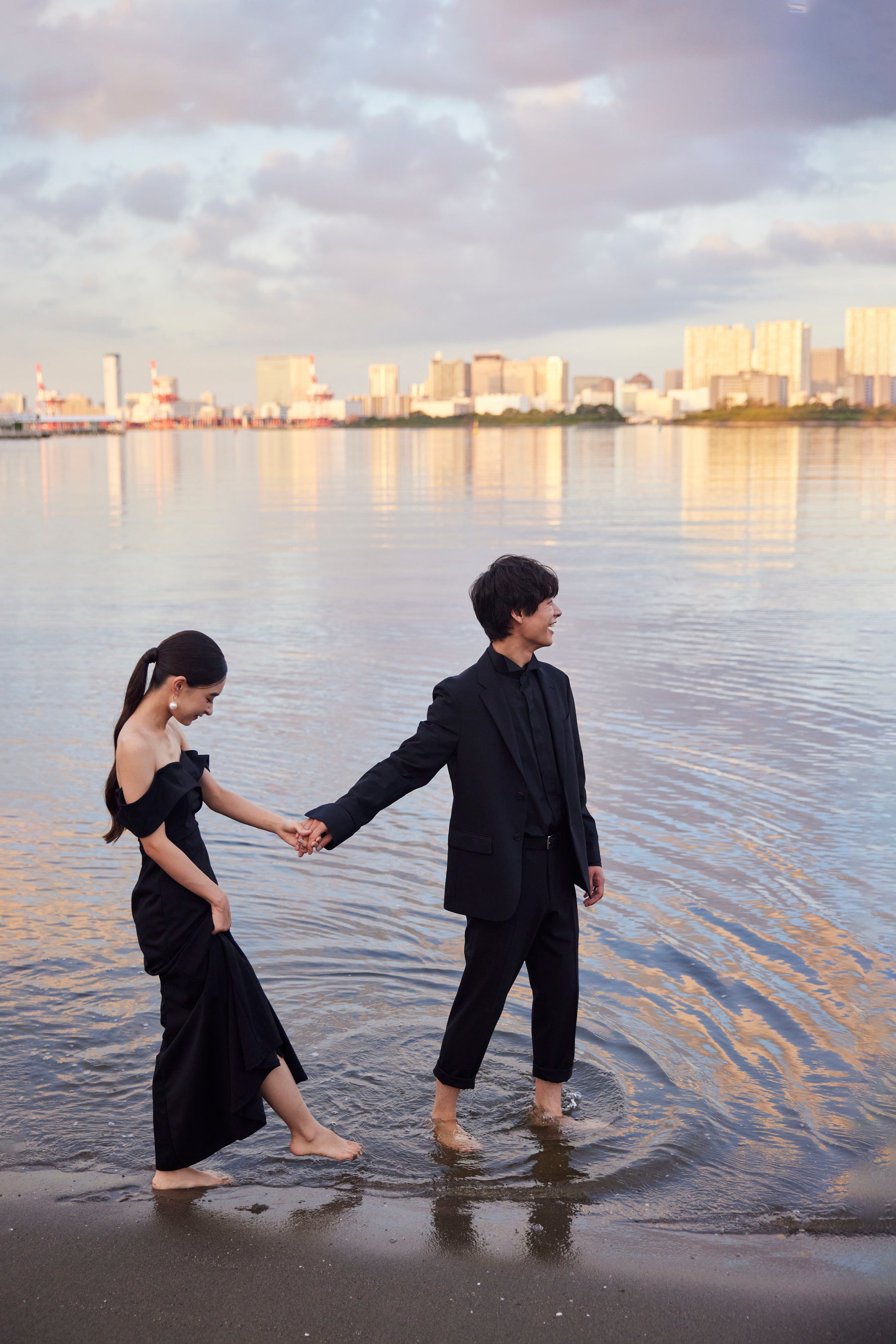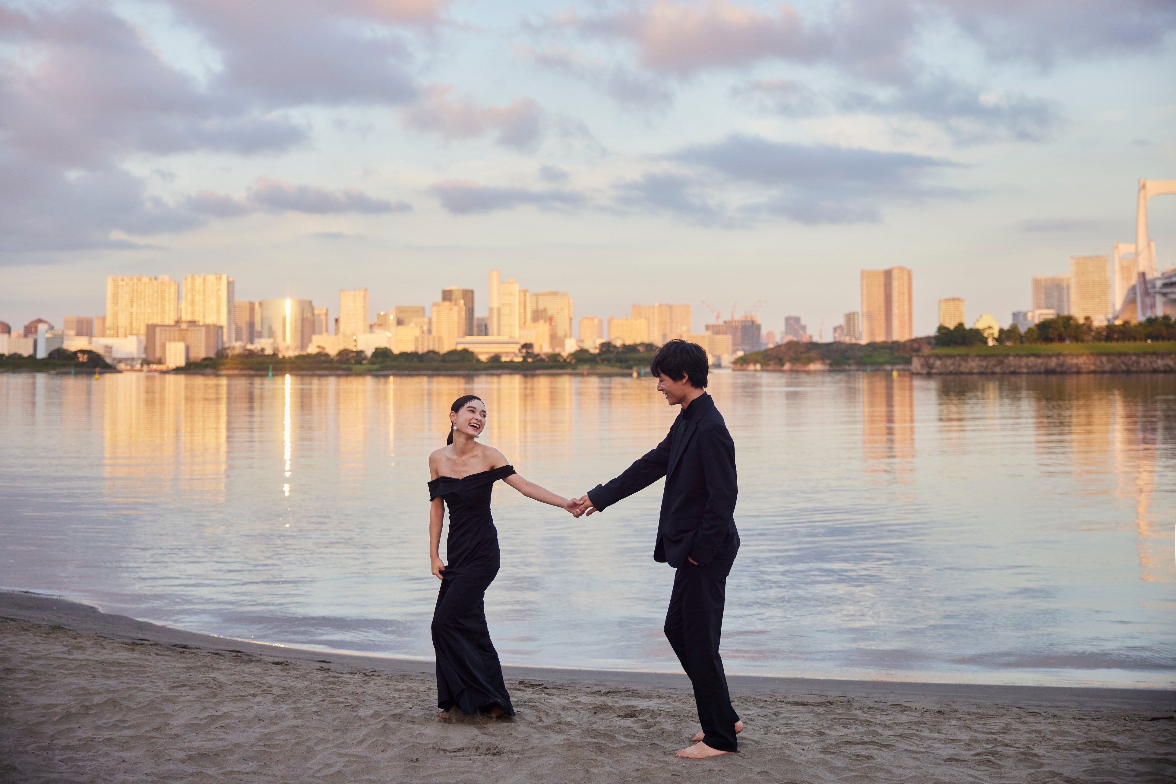 まず最初にご紹介するのはお台場海浜公園。水面の向こうにビル群が浮かぶ、都会ならではの景色です。右側にはレインボーブリッジも。夕陽や青空で表情を変える東京の海を楽しみながら、お二人のお好みに合わせたフォトウェディングをお届けいたします。