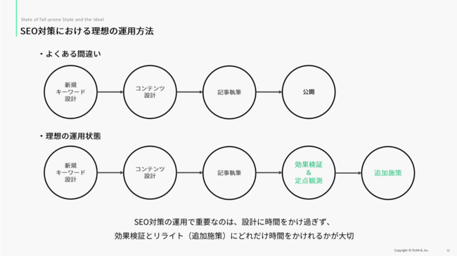 コンテンツSEO対策に「必要なキーワードの選定、新規記事作成、既存記事のリライト、施策ログの蓄積や効果測定」など、PDCAをしっかりと回す運用を理想とした機能設計により、自社内でコンテンツSEOに取り組む企業様のご支援が可能です。