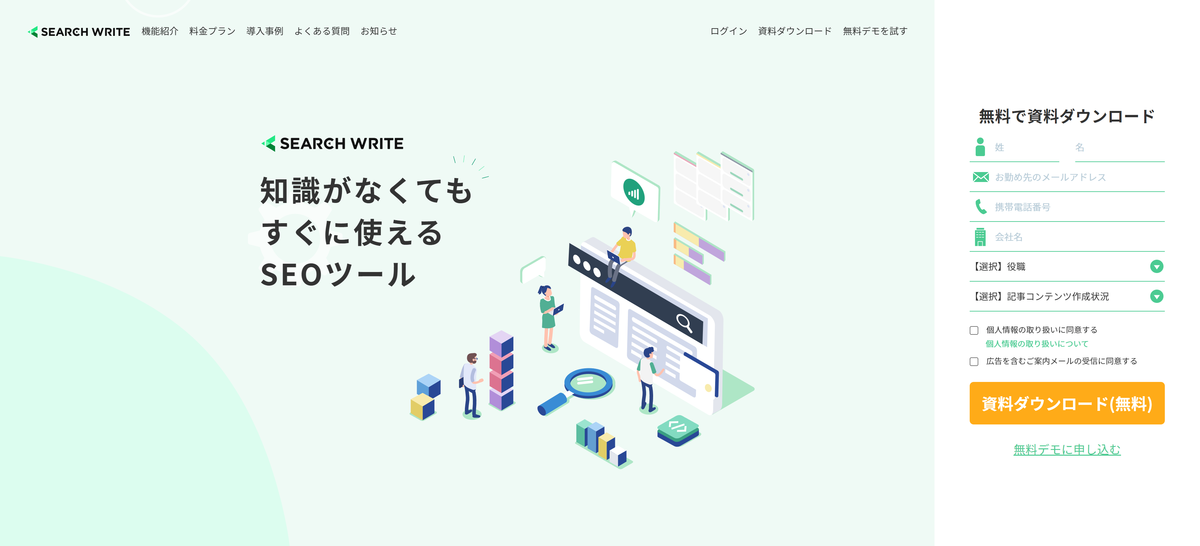 「SEARCH WRITE」は “知識がなくてもすぐに使えるSEOツール” をコンセプトに、数字を見て改善点がわかるだけでなく、誰でも手軽にツールを使いこなし、成果を出すことができるよう運用をサポートするSEOツールです。