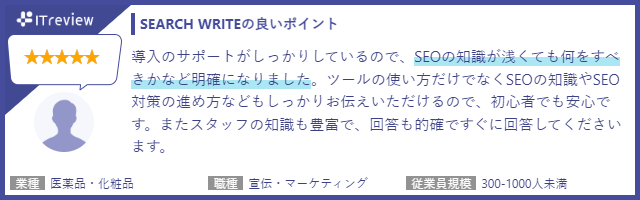 ITreviewにて、SEARCH WRITEを実際に利用いただいているお客様よりたくさんのお声をいただいております。ご利用者からは「SEOの知識がなくても、何をすべきか分かりやすい」「導入サポートが手厚い」「工数が大幅に削減できた」などのコメントをいただきました。