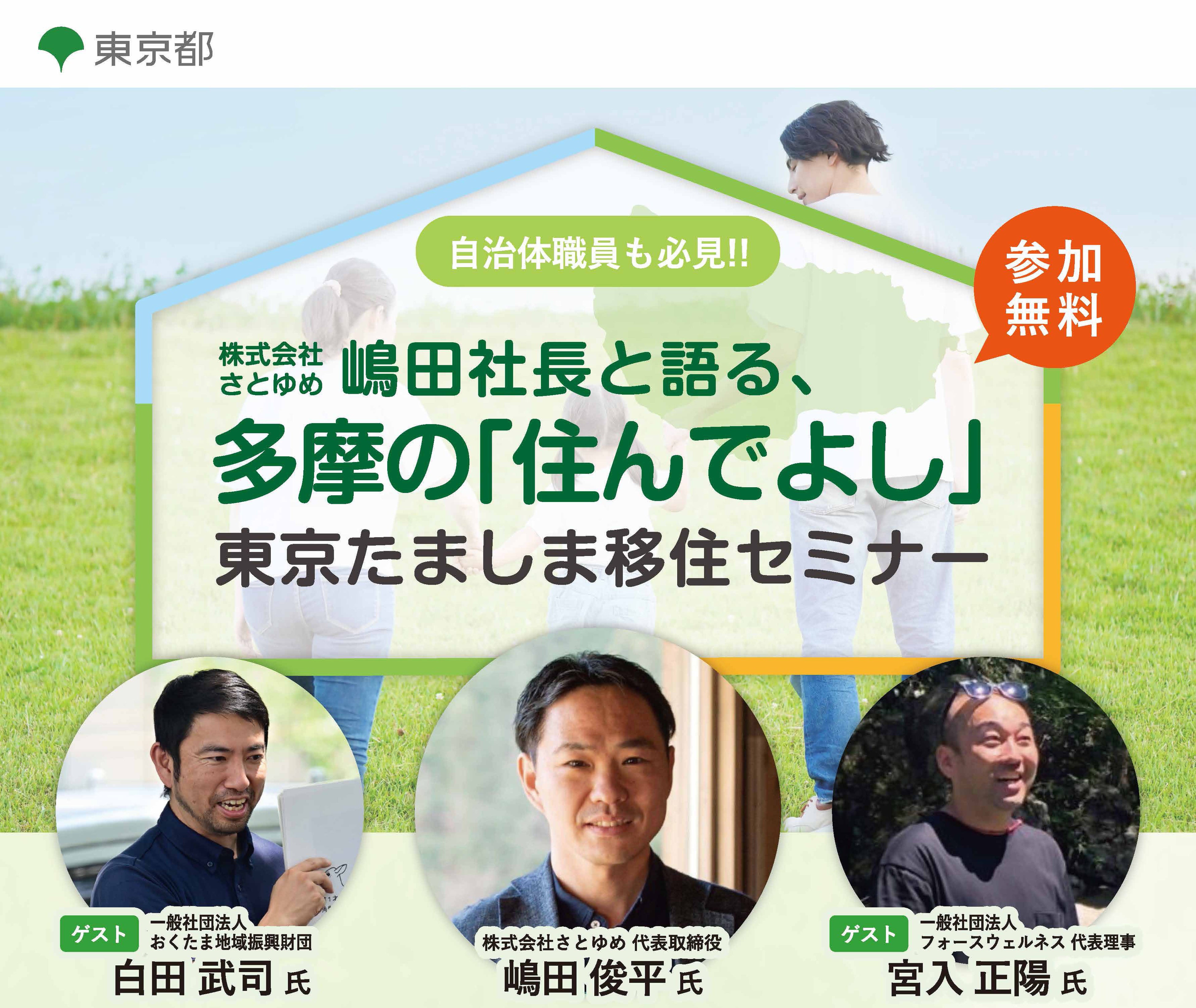 ゲストにおくたま地域振興財団・白田氏と、あきる野市に移住し西多摩のリブランド「東京山側」を掲げる宮入氏を迎え、株式会さとゆめが行う移住・定住に関する取組と多摩の魅力と可能性について語り合います。