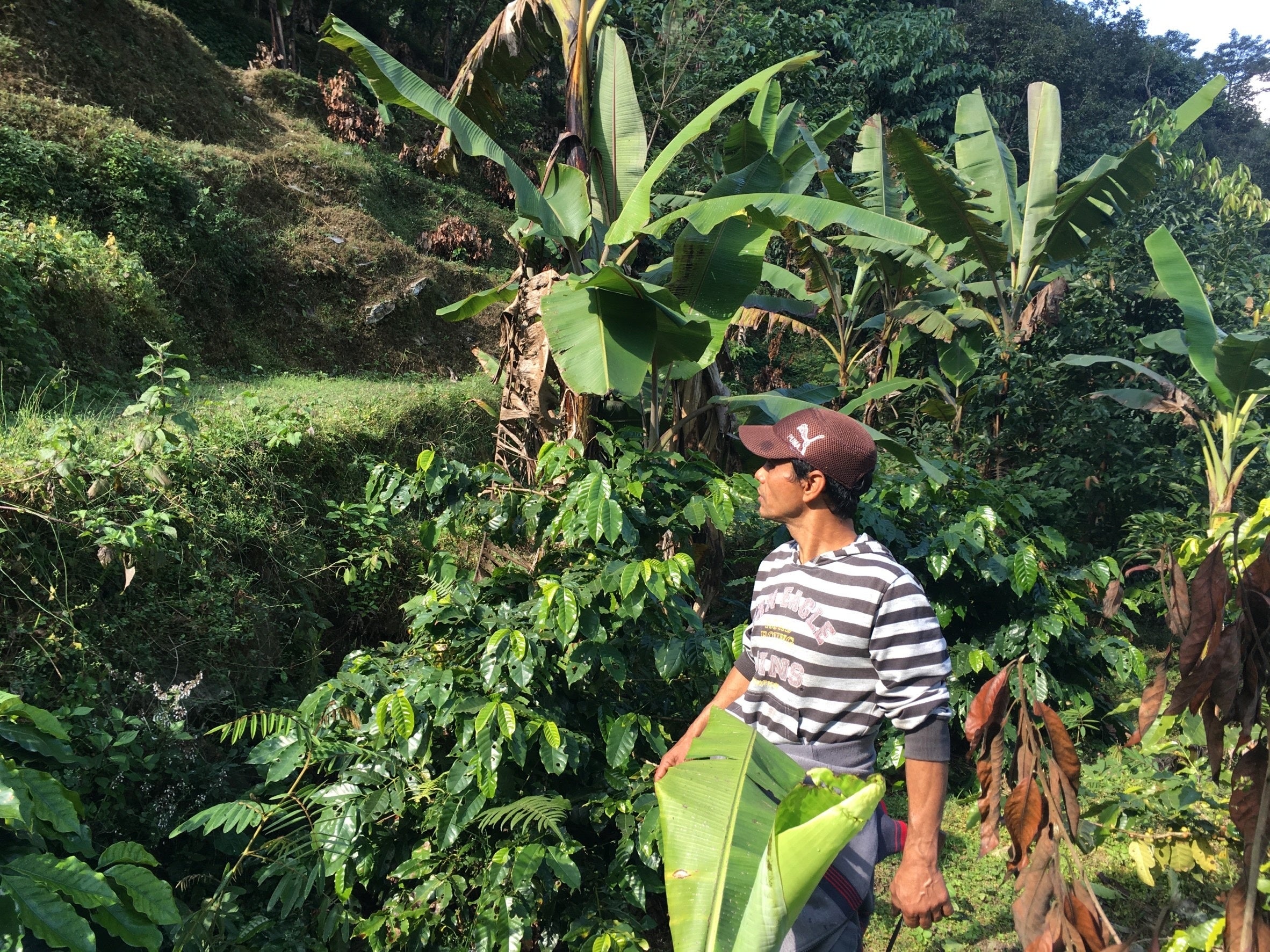 農園内の一角。コーヒーノキを護るようにバナナの木がそびえ立つ。