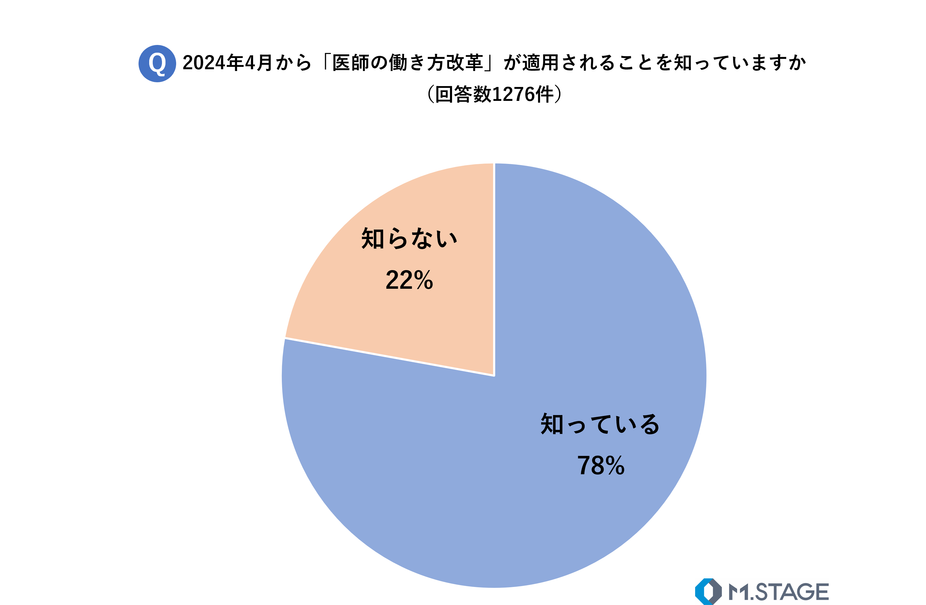 2024年から医師の働き方改革の適用が始まることを知っているかについて質問したところ、78%が「知っている」、22%が「知らない」と回答しました。2024年4月まで残り2年を切る中で、全体の2割以上が2024年の「医師の働き方改革」の適用を知らないと回答しており、まだまだ認知度が高いとは言い切れない状況が分かりました。