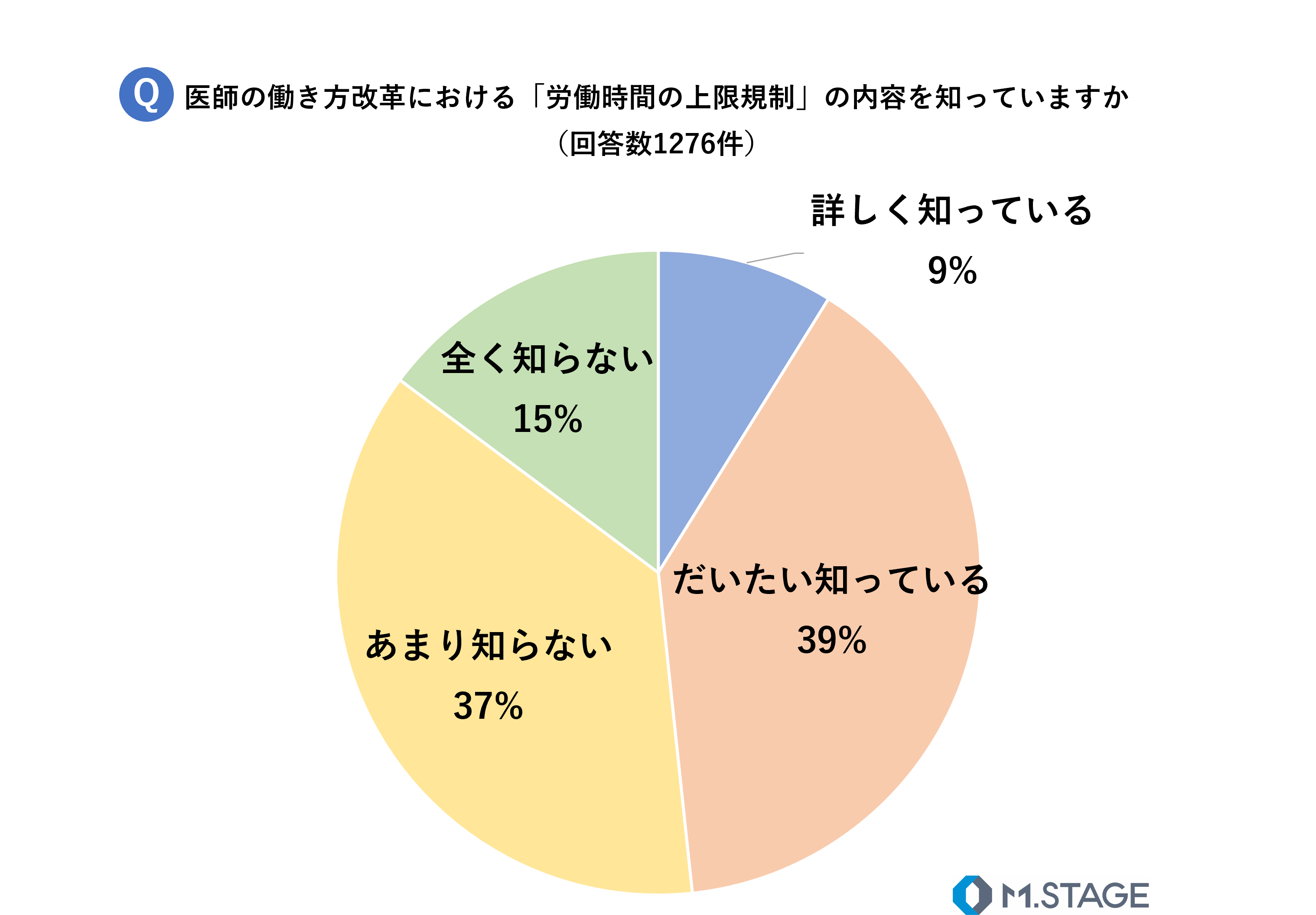 この「労働時間の上限規制」の内容を知っているかについて質問したところ、9%が「詳しく知っている」、39%が「だいたい知っている」、37%が「あまり知らない」、15%が「全く知らない」と、回答しました。「あまり知らない」と「全く知らない」を合わせると、内容をよく知らない医師は全体の半数以上を占めました。