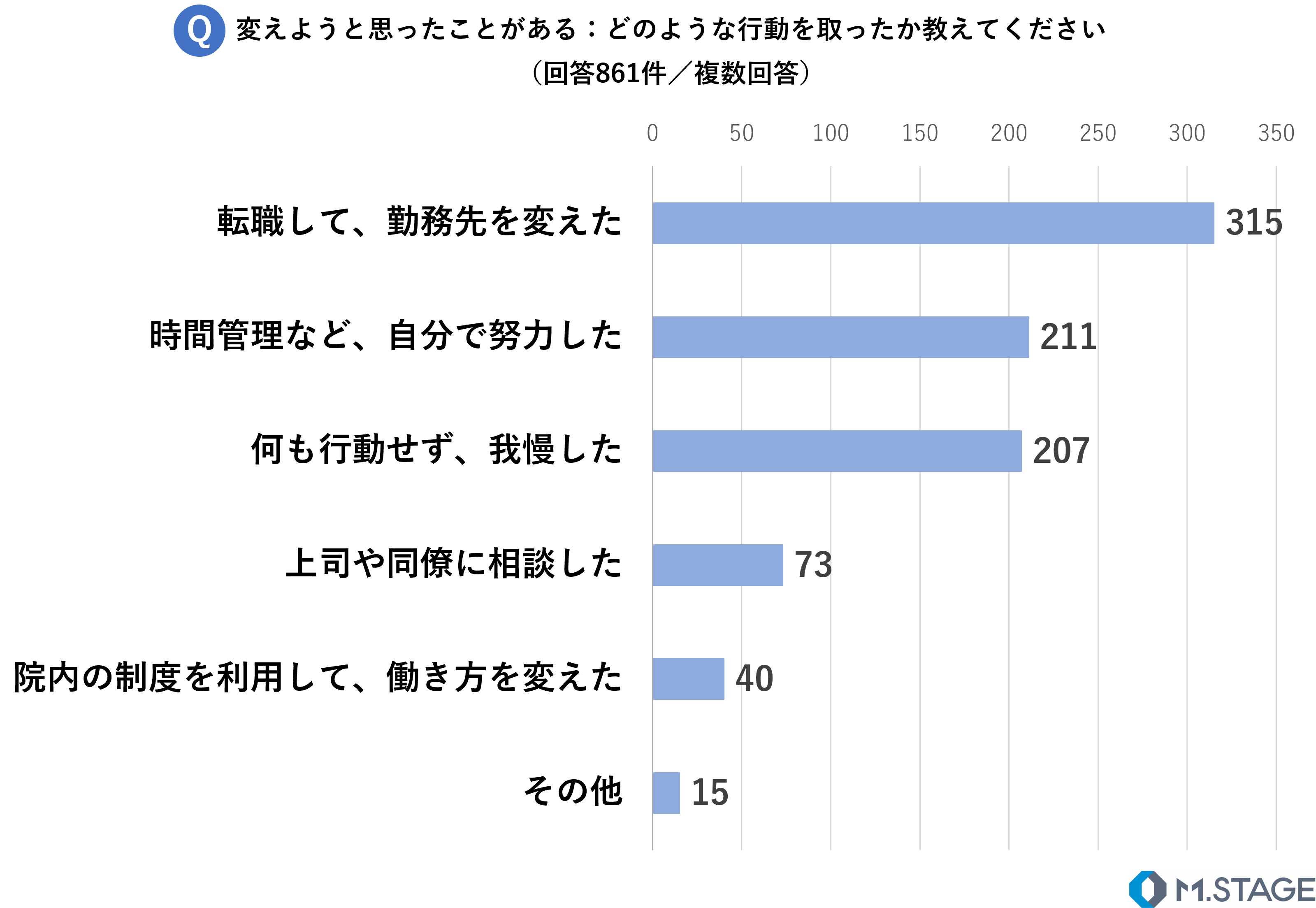 「その他」の回答では、“裁判を起こした(50代女性・その他の専門)”、“労働基準監督署に相談した(50代男性・その他の専門)”、“留学を決めた(30代男性・外科系)”、“フリーランスになった(40代男性・その他の専門)”などの回答がありました。