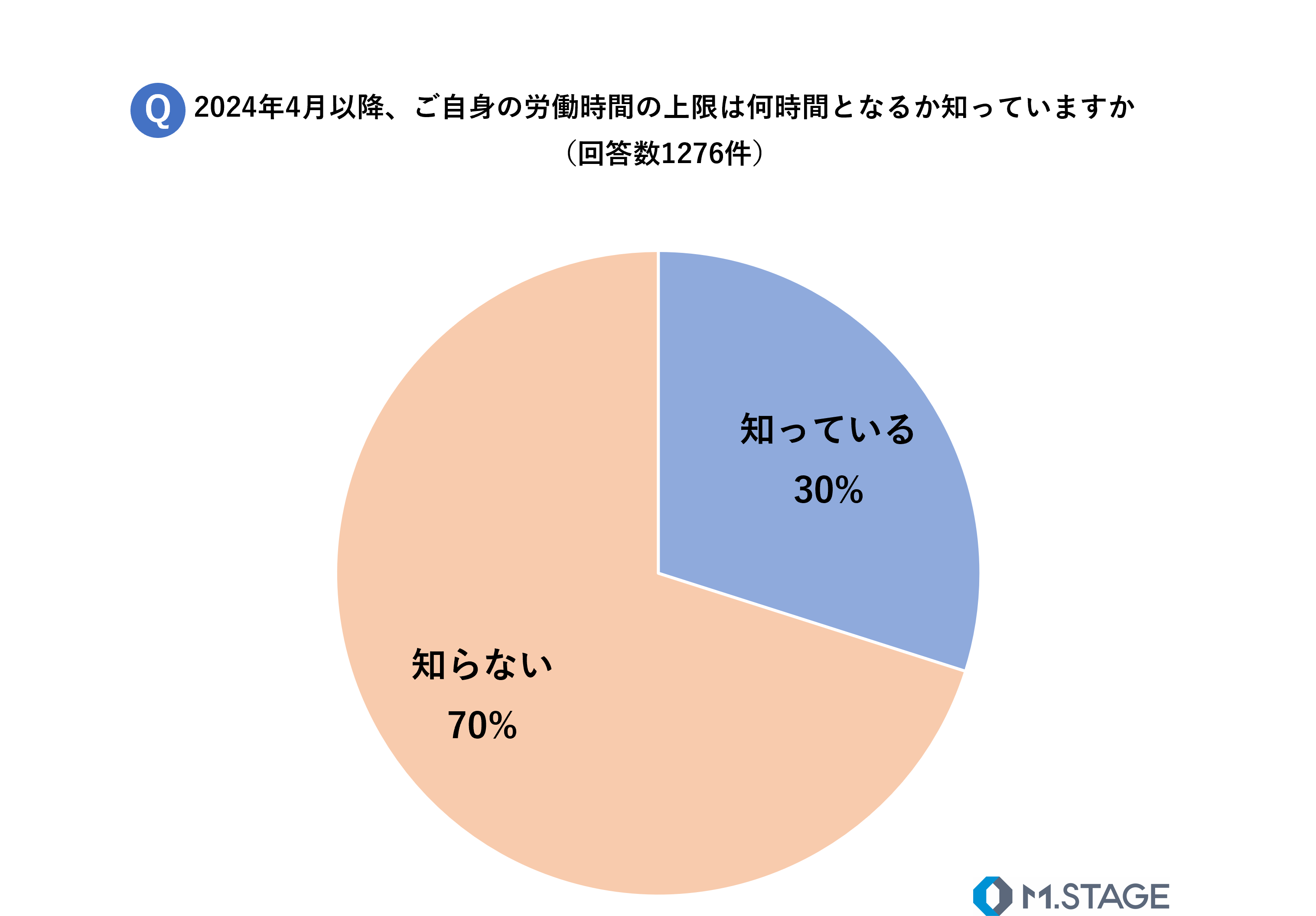医師の働き方改革により労働時間の上限規制が設けられることで、2024年以降の自身の労働時間上限が何時間となるか知っているかについて質問したところ、70%が「知らない」、30%が「知っている」と回答しました。自身の労働時間がどのような影響を受けるかを把握していない医師が全体の7割を超える結果となりました。