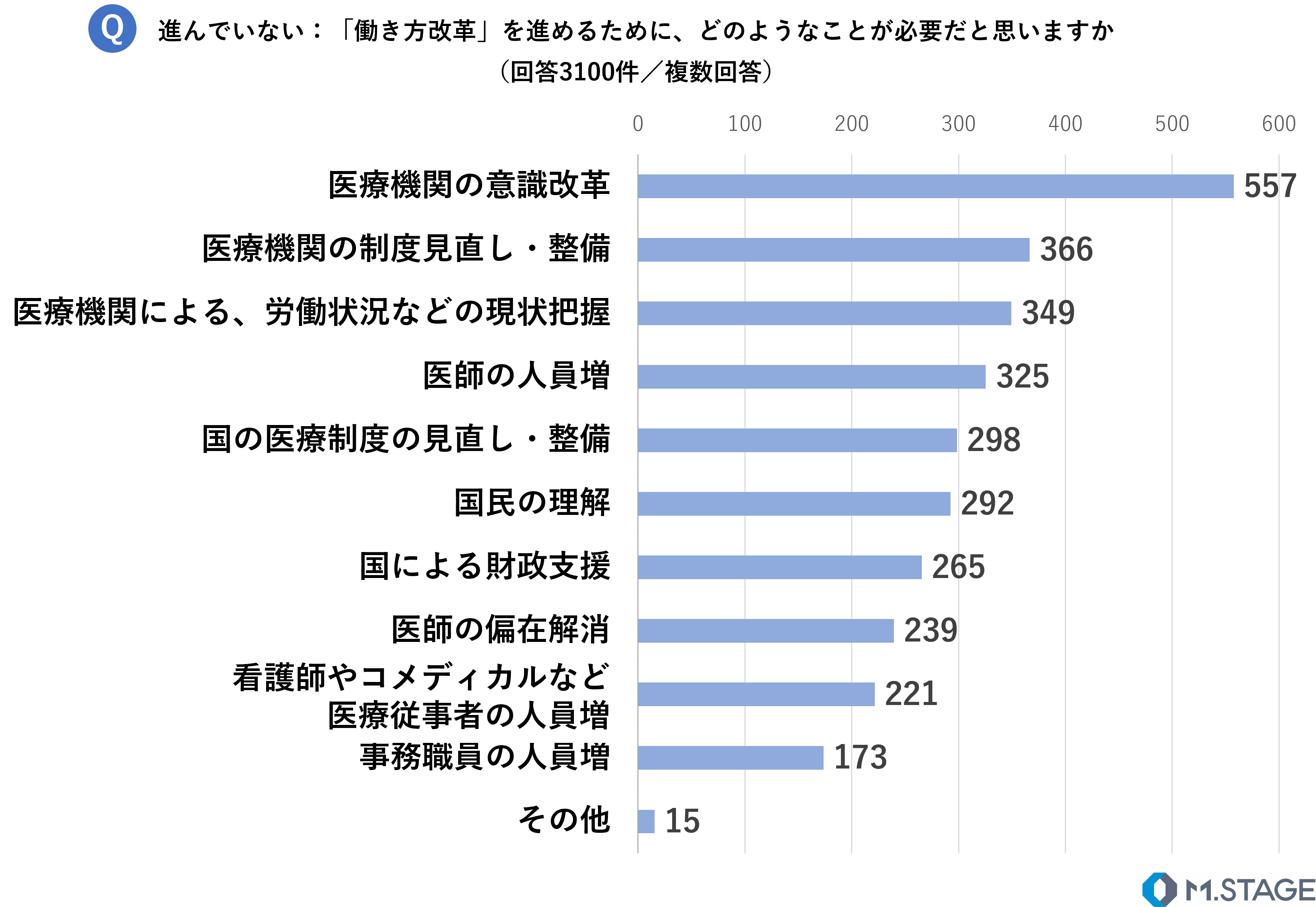 回答のTOP3は、1位「医療機関の意識改革」、2位「医療機関の制度見直し・整備」、3位「医療機関による、労働状況などの現状把握」となり、医療機関の意識改革が最も重要であるという回答となりました。