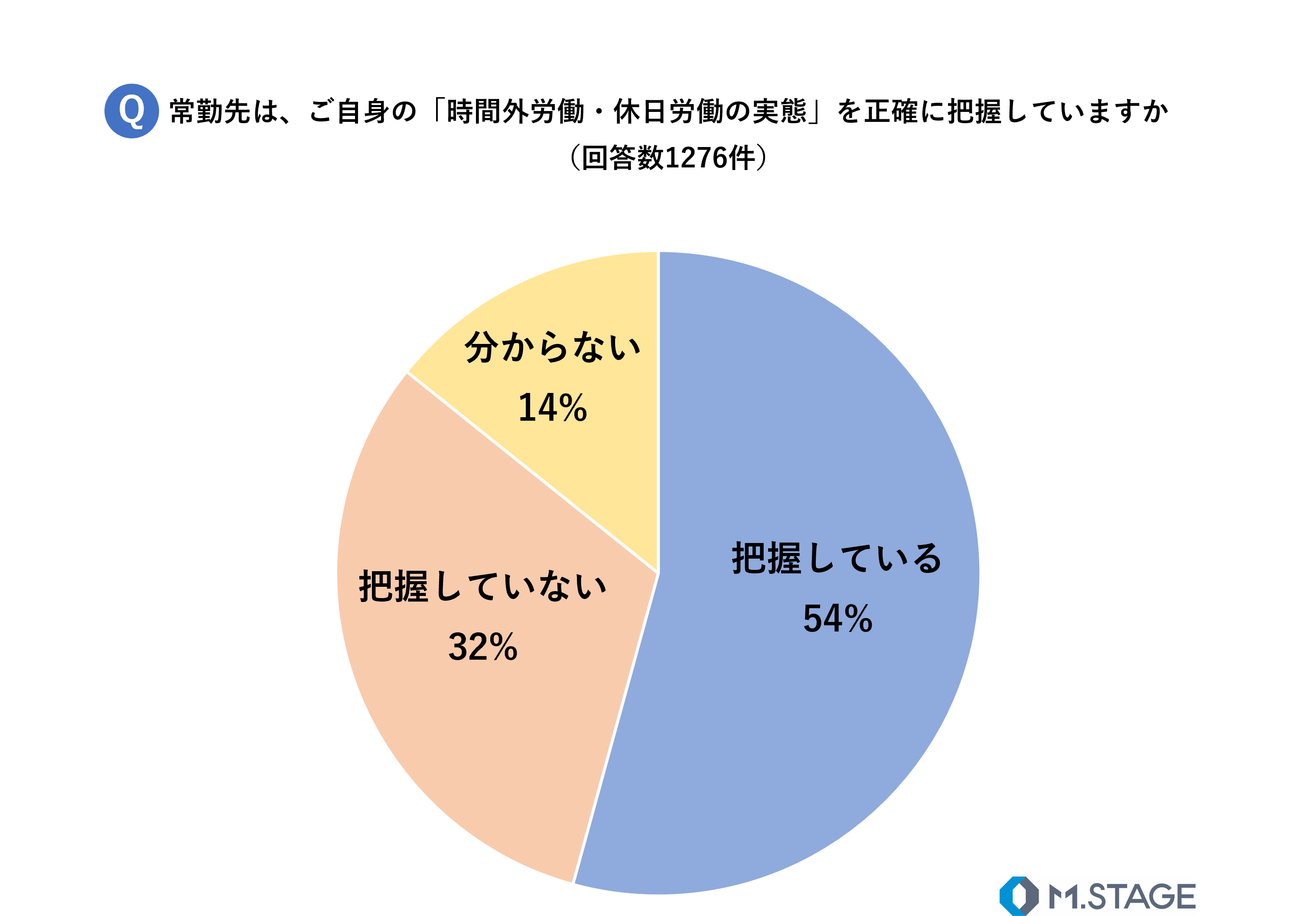 常勤先が、医師の「時間外労働・休日労働の実態」を正確に把握しているか質問したところ、54%が「把握している」、32%が「把握していない」、14%が「分からない」と回答し、正しく把握していると回答した医師は約半数となりました。
