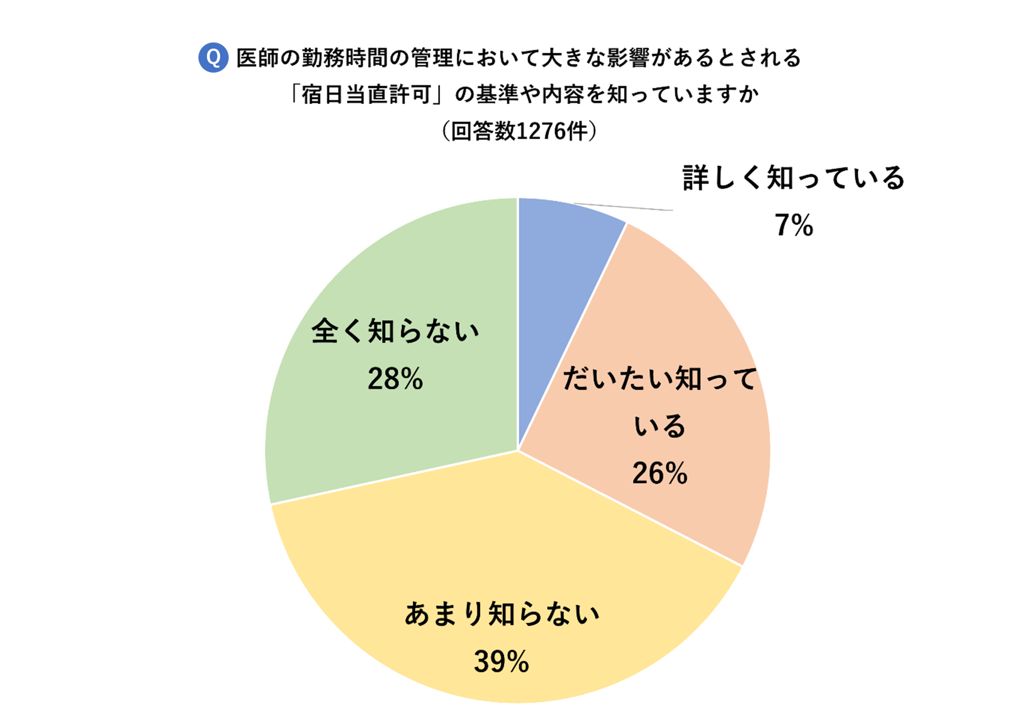 この「宿日直許可」の基準や内容を知っているかについて質問したところ、7%が「詳しく知っている」、26%が「大体知っている」、39%が「あまり知らない」、28%が「全く知らない」となり、「あまり知らない」と「全く知らない」を合わせ約7割が、自身の労働時間上限の管理に関わる「宿日直許可」について理解していないことが分かりました。