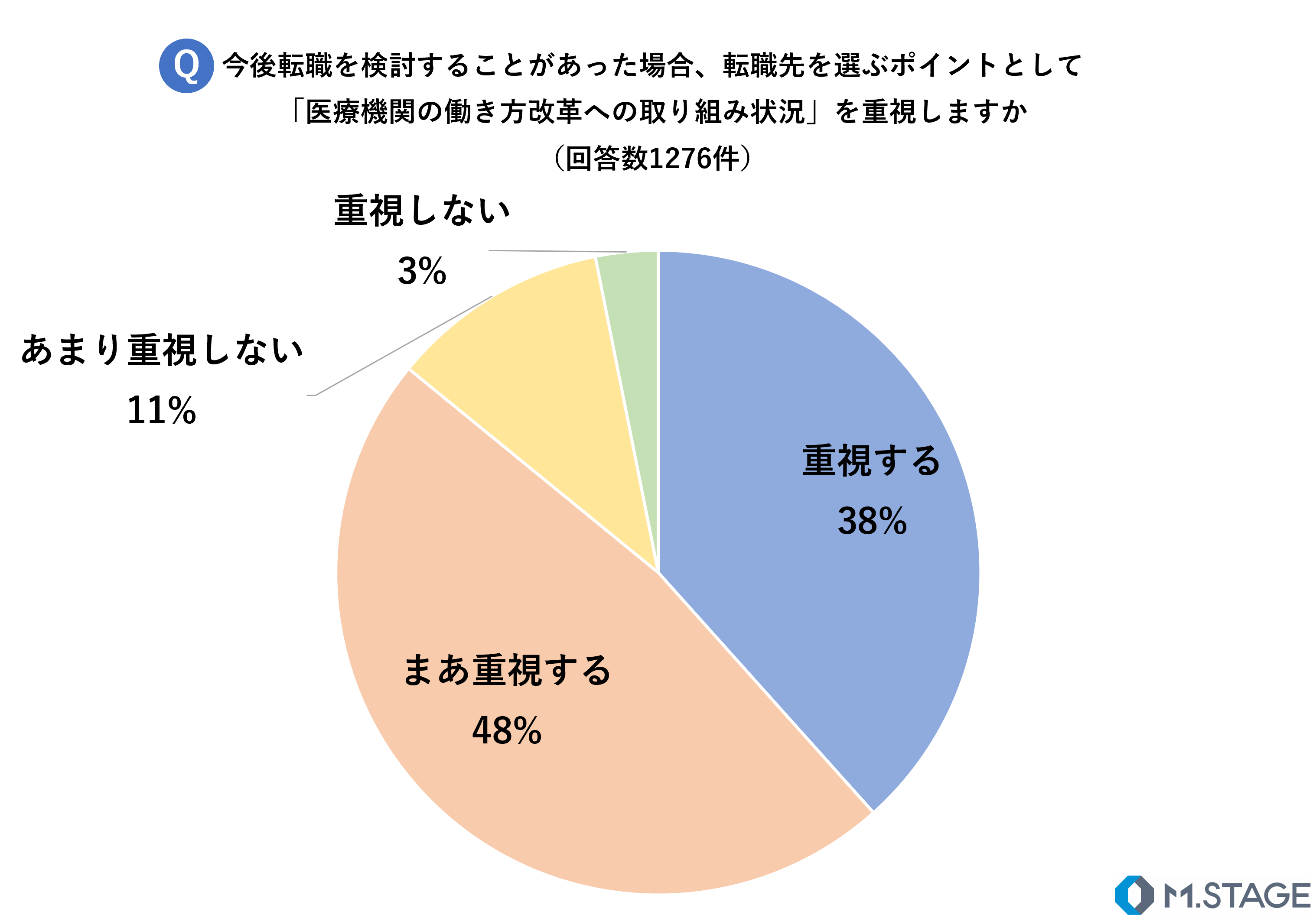 今後転職を検討することがあった場合に、転職先を選ぶポイントとして「医療機関の働き方改革への取り組み状況」を重視するかを質問したところ、38%が「重視する」、48%が「まあ重視する」と回答し、86%の医師が医療機関を選ぶ際に働き方改革の取り組みを重視していることが分かりました。