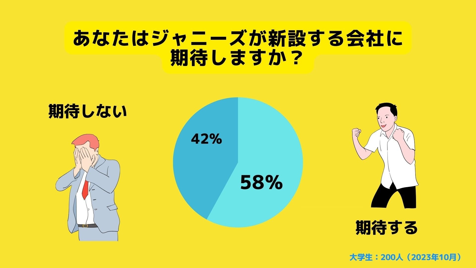 今回発表されたジャニーズが新設する会社に「期待する」と回答した大学生が58%と過半数を占める一方で、42%もの大学生が期待しないと回答しました。なお、本調査の結果は10月3日時点での回答となります。