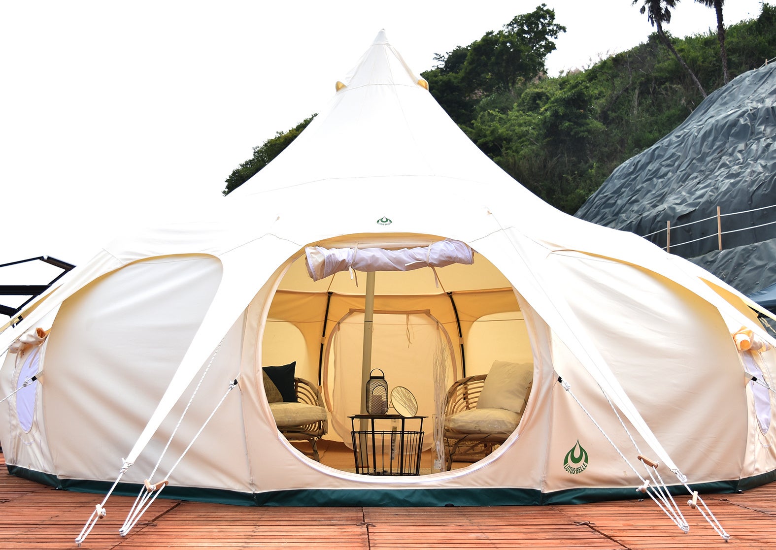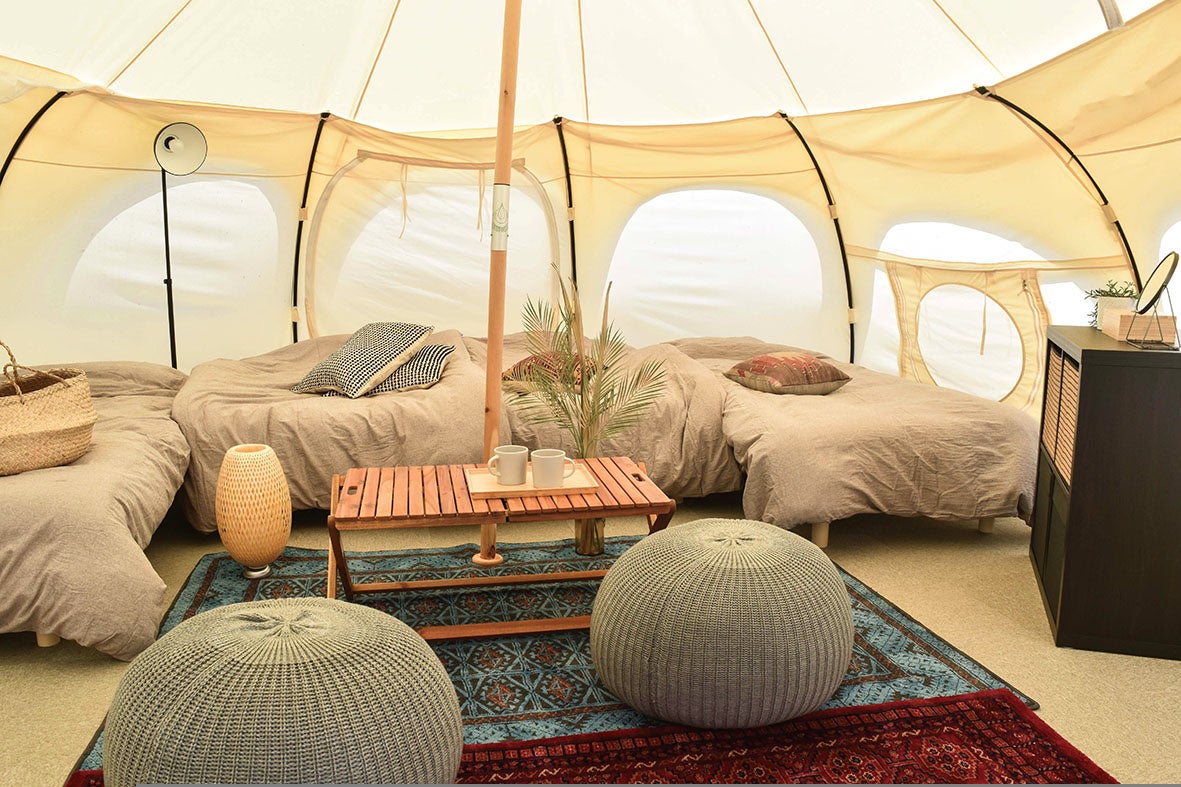 8月10日には1日3棟限定のプライベートな空間で過ごすことができる、グランピング施設がオー プンします。テントのインテリアは自然をイメージしており、「海」「風」「大地」をテーマにデザイン。 併設されているテラスのソファでは食事を楽しんだり、ゆっくりとくつろいだりと、瀬戸内海でも エーゲ海と呼ばれる牛窓のリゾート感を満喫できます。