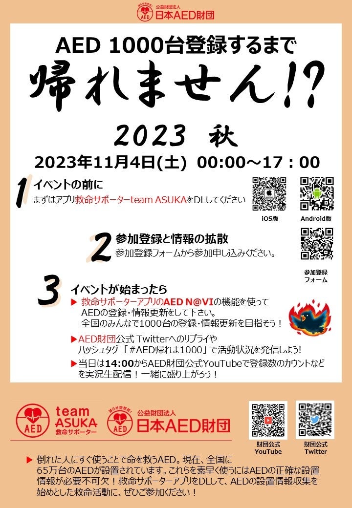 財団公式Twitterも随時更新しますので、リプライや、「#AED帰れま1000」を付けた発信をお待ちしています。