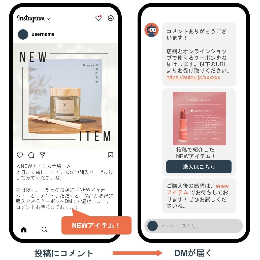 Instagramのフィード投稿で指定した、特定のワードをコメント欄に記入すると、ユーザーのDMに自動でクーポンを送付。購買意欲を高めることが可能に。