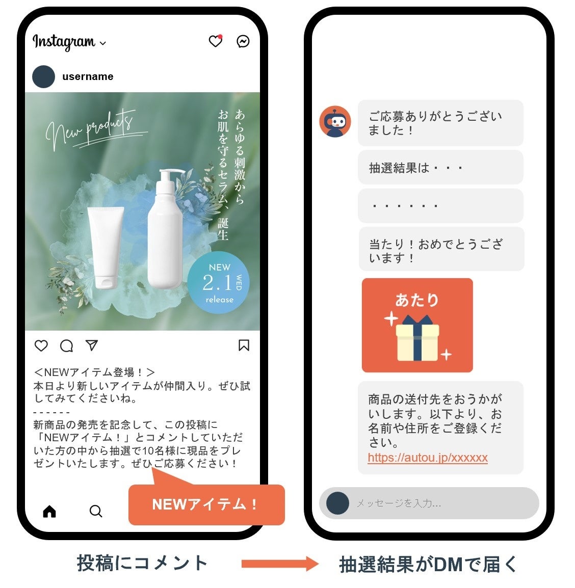 Insrtagram上で行うキャンペーンの投稿に対し、指定のワードをコメント欄に記入することでキャンペーンに参加ができ、DM上でその場で当落選の通知をすることができる。