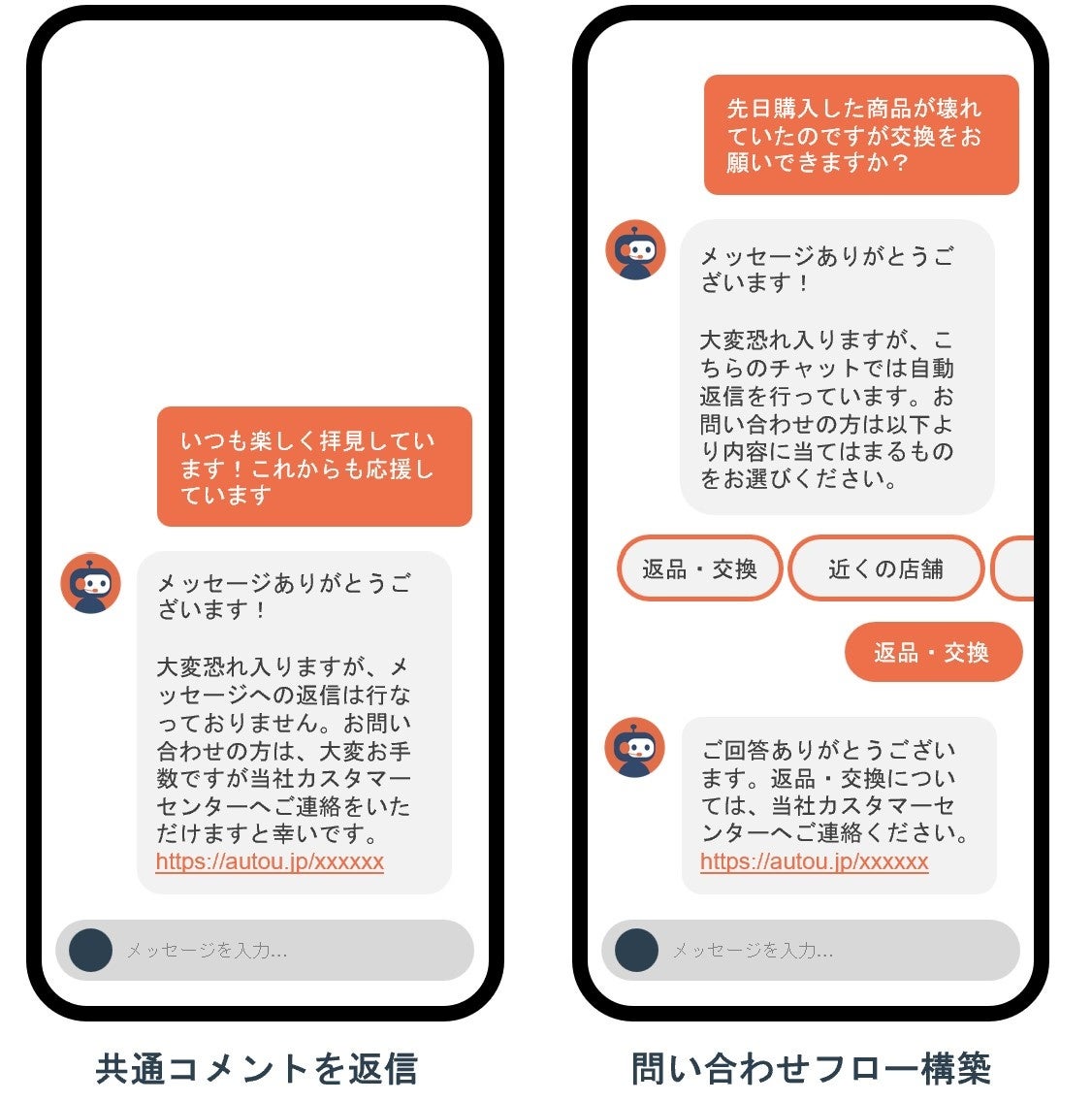 運用する企業公式のInstagramアカウントにユーザーからDMで問い合わせが来た際、企業が設けている正式なお客様問い合わせ用のアドレスやウェブページへの案内を、自動で対応する。