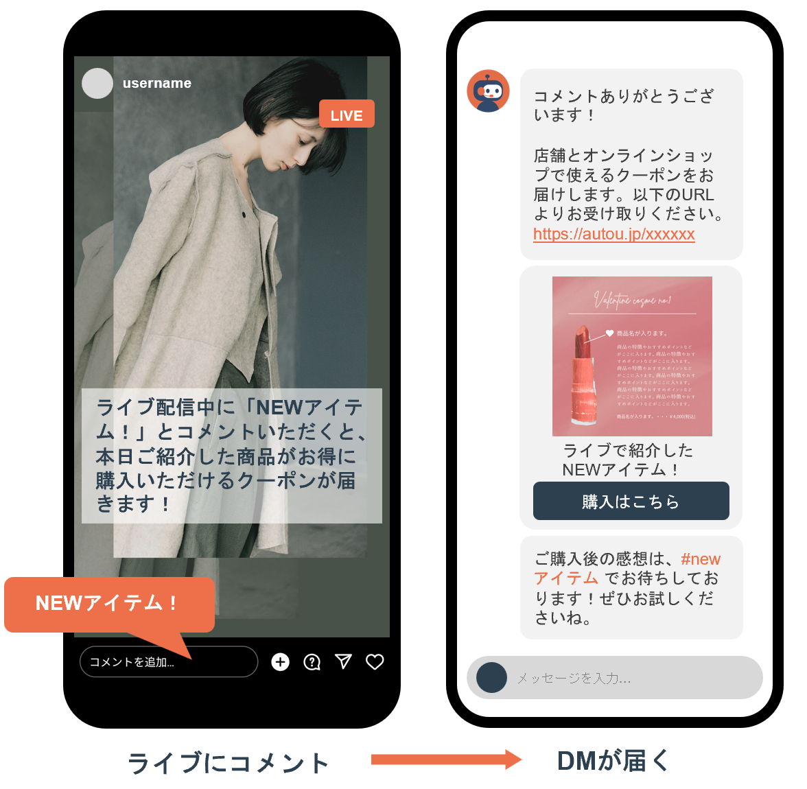 ライブ配信中に指定したワードをコメント欄に記入するとユーザーのDMに自動でクーポンを送付。ライブ配信により商品への関心度を高めつつ、リアルタイムでクーポンを配布することで購買意欲をより向上させることが可能に。
