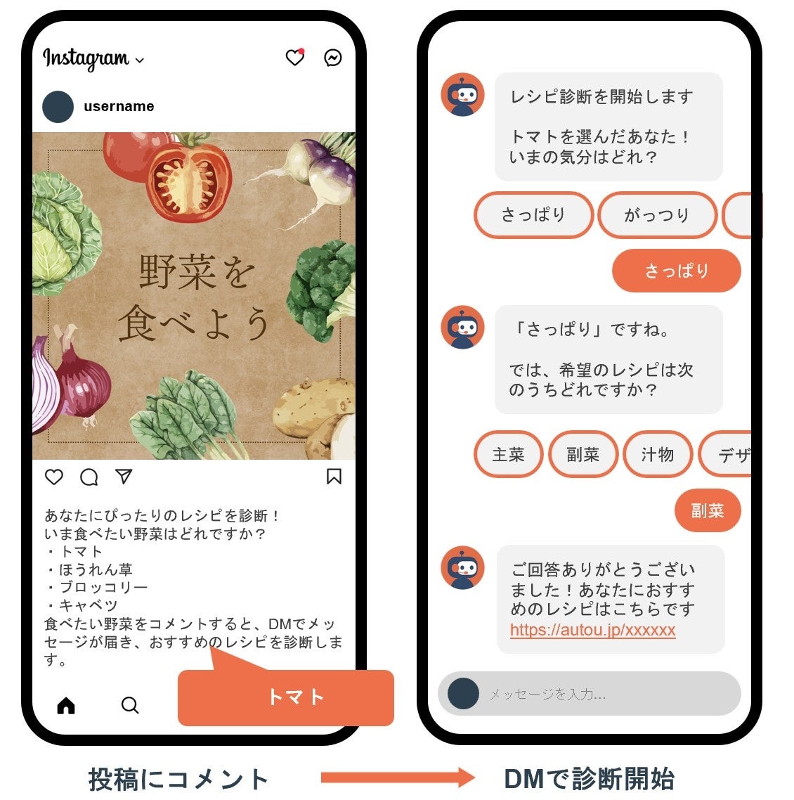 Insrtagramのフィード投稿で指定された特定のワードをコメント欄に記入すると、DM上に質問を自動で送信。質問への回答に応じて自動で診断を行い、診断内容をもとに最終的におすすめのレシピや商品の情報を送付。