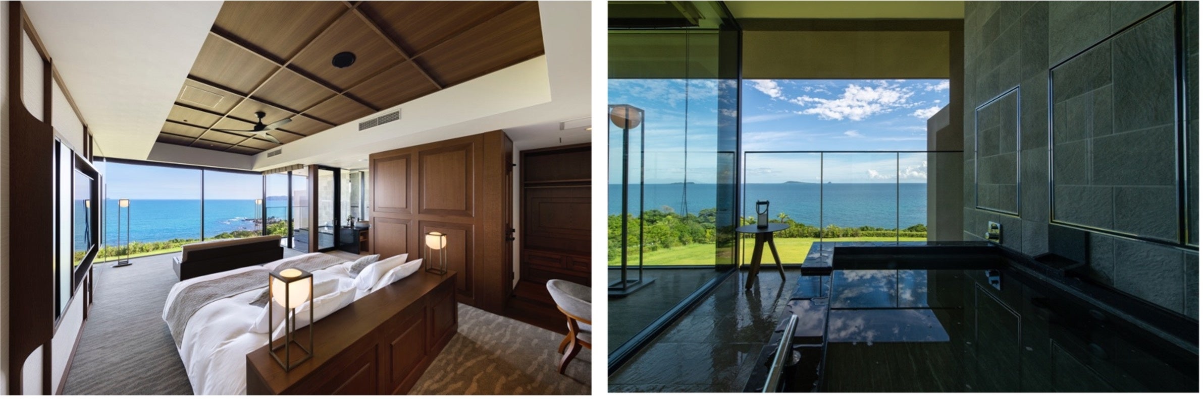 3. 全室海に面した客室は7.4mのワイドスパンとフルハイトサッシを採用、テラスには露天風呂を配した