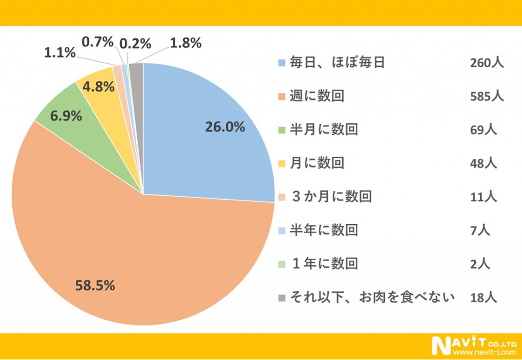 大多数の方がお肉が好きだと回答されていますが、いったいどのくらいの頻度でお肉を食べているのでしょうか。「週に数回」という方が58.5%と一番多く、半数以上を占める結果でした。その次は「毎日、ほぼ毎日」26.0%。その後は、「半月に数回」(6.9%)「月に数回」」(4.8%)と続いています。