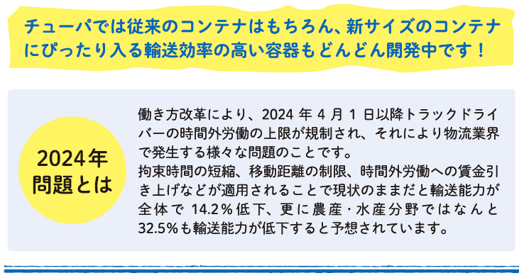 コンテナ活用コーナーでは、2024年問題で予想される物流業界での輸送能力低下を踏まえ、コンテナを最大限活用し、物流の効率化を図れる容器をご紹介します。また、農産品物流の改善・効率化のために農林水産省から発行されたガイドラインで推進される、パレットサイズの標準化に向け、1100×1100mmのパレットに合うコンテナと対応する容器についても展示いたします。