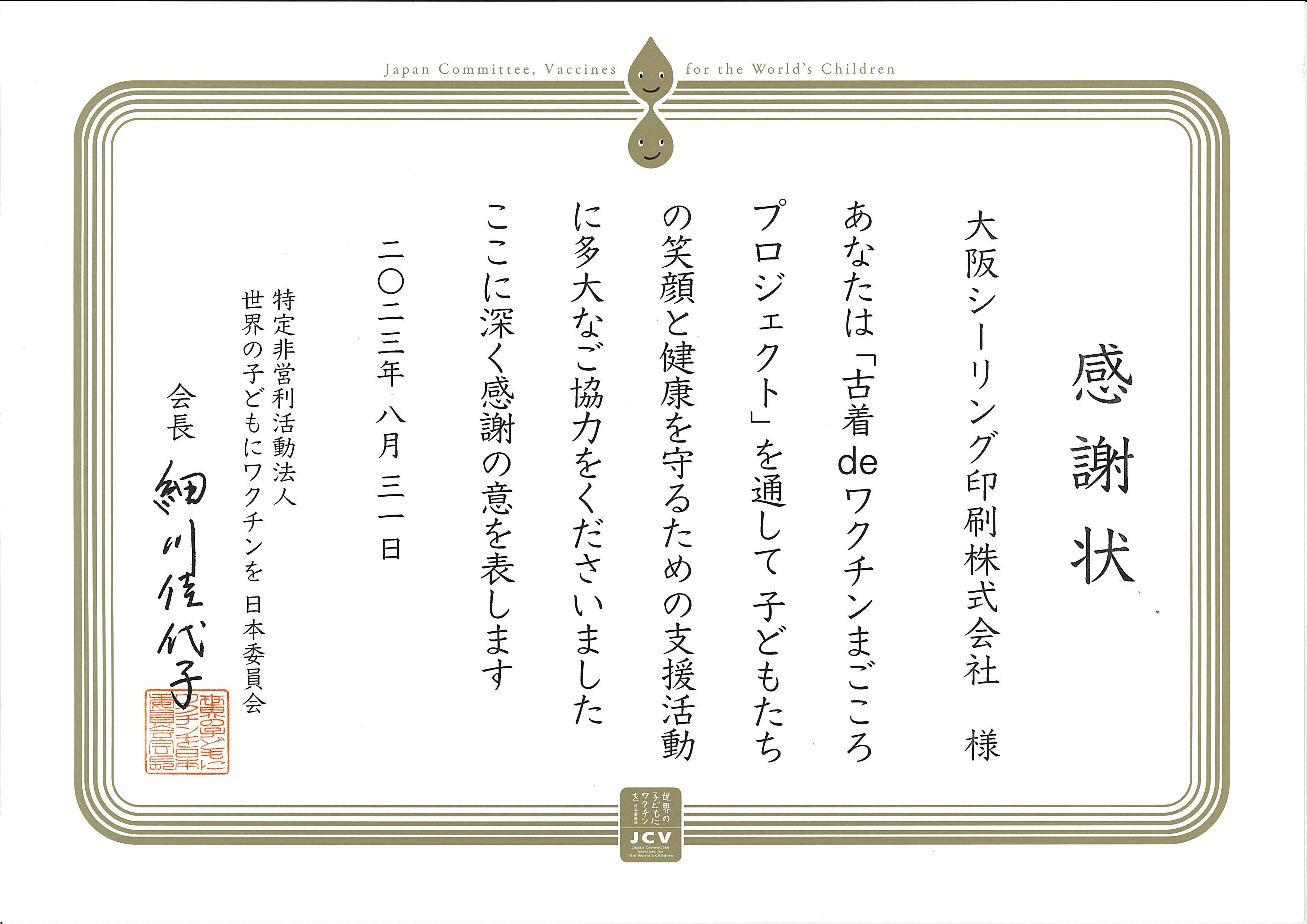本活動は、不要になった衣類や服飾雑貨の専用回収キットを購入することで、「認定NPO法人世界の子どもにワクチンを 日本委員会(JCV)」を通じて、ポリオワクチンを途上国の子どもたちに贈る取り組みです。回収された衣類や服飾雑貨は再利用される他、回収・輸出・販売の過程で新しい雇用を生んでいます。これらはSDGsの17の目標のうち、9つのゴールに該当する社会貢献活動であることに賛同し、企業・団体向けの「まごころプロジェクト(Bプラン:専用回収キット100)」に参加する運びとなりました。
