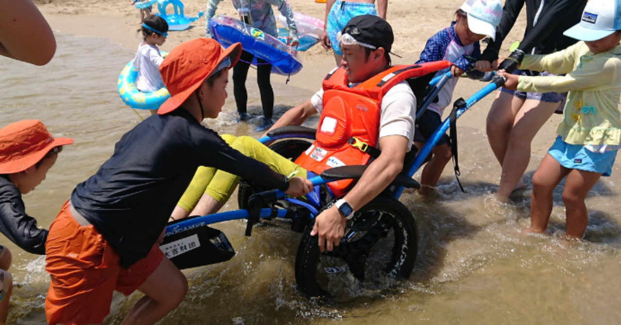 今回、全国から集まる教育者たちが、「障がいがあってもなくても、自分自身の人生を自ら決定し、社会の中ですべての人がお互いに依存し、頼られながら育まれていく本当の自立(自律)を目指す授業、もしくは学校、地域活動」を構想する中で、辻堂に集まってキャンプを一日経験します。(下写真:須磨ユニバーサルビーチプロジェクト提供)