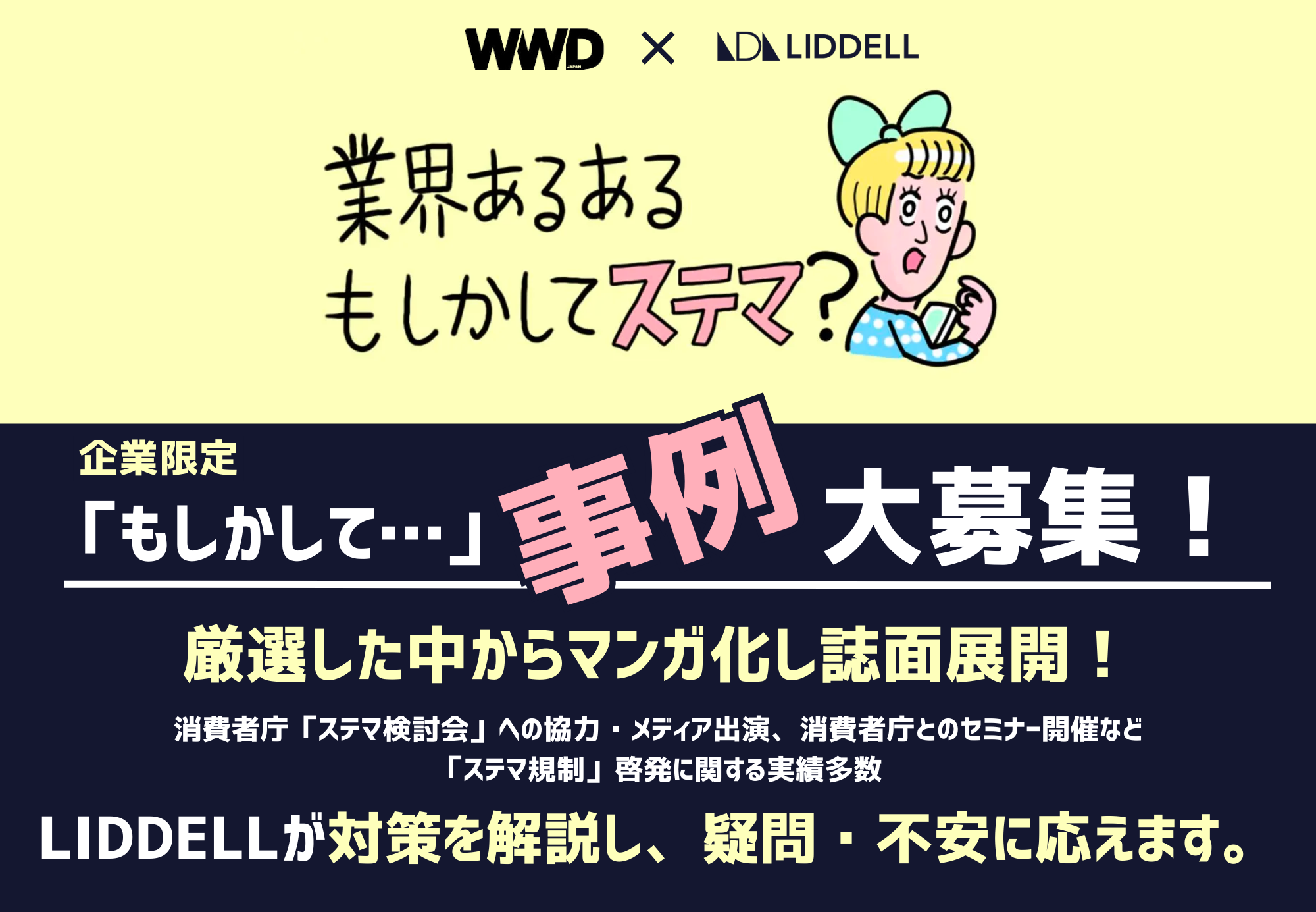本企画において、企業が「ステマかどうか判断に悩む」事例を募集。応募いただいた事例の中から、厳選して紙面やウェブ、SNS展開いたします。また、寄せられた事例に対しては、消費者庁の運用基準に準じた対策をリデルが個別に提示・解説いたします。