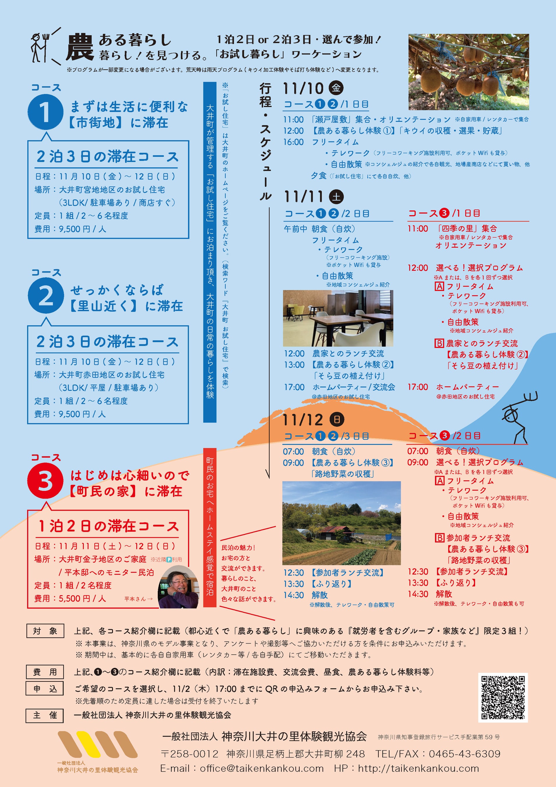 コース3は、1泊分の施設滞在費、11日昼・夕食、12日昼食、農ある暮らし体験料等