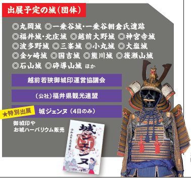 お城好きが集まるフェス。福井県内には15以上の城や城跡を所持する市町があり、越前若狭の城が初めて大集合します。来年は丸岡藩誕生400年や、3月16日に北陸新幹線が福井まで延伸するため、福井への注目が非常に高まっています。そんな福井で、城好きの著名人を招いてトークイベントをしたり、グッズ販売を行います。