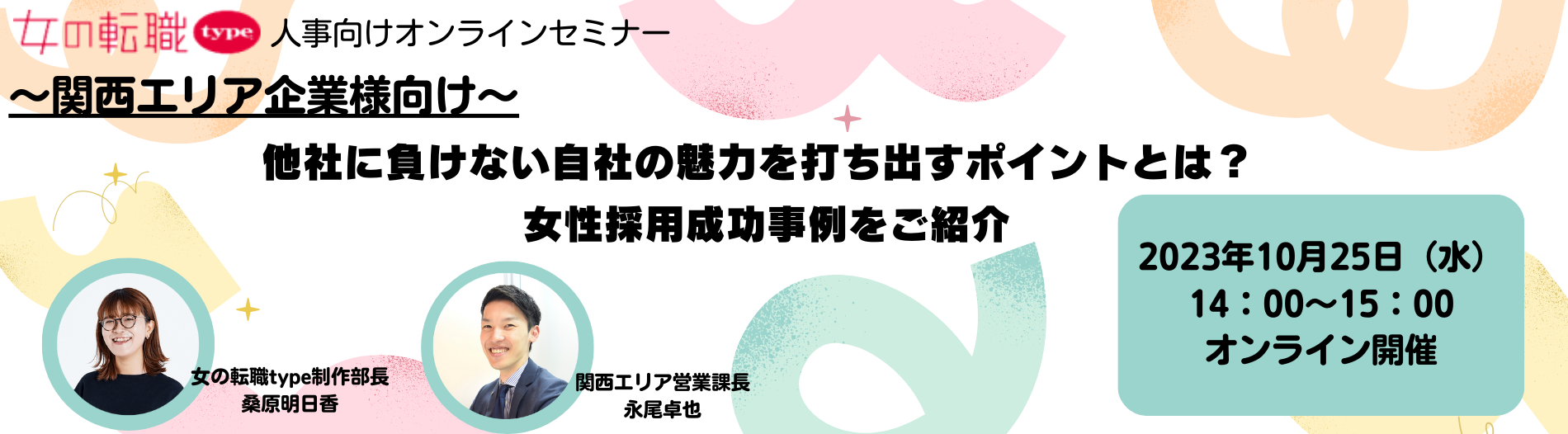 転職サイト「女の転職type」では、10/25(水)14時より「関西エリア企業様向け 他社に負けない自社の魅力を打ち出すポイントとは?女性採用成功事例をご紹介」を開催いたします。