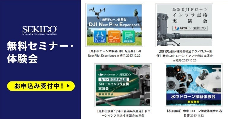 セキドでは、より多くの事業者の方にドローンを使った業務効率の改善を実現していただくため、業務用ドローンや関連ソリューションをご紹介する無料セミナーやイベントを定期的に開催しております。今後もオンラインや全国各地での開催を予定しておりますので、ご興味をお持ちのイベントにはぜひお気軽にご参加ください。