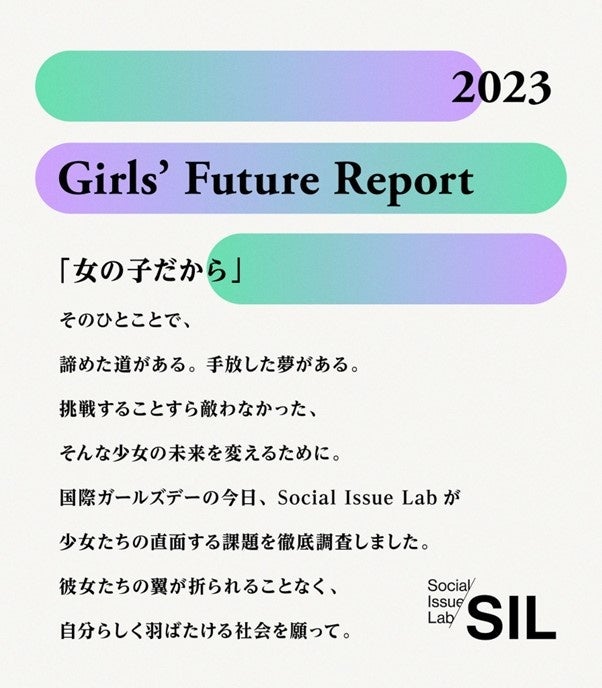 国際女性デーの今日、その第1弾レポートとして「ガールズ」をテーマにした「Girls’ Future Report」を発表いたします。「女の子らしく」といったステレオタイプな女性像を10代の頃から背負わされている少女たちの実態や、身近にはびこる家庭内のジェンダーギャップを可視化すると共に、彼女たちが感じているリアルな思いや、思い描く夢や理想を明らかにしていくレポートです。
