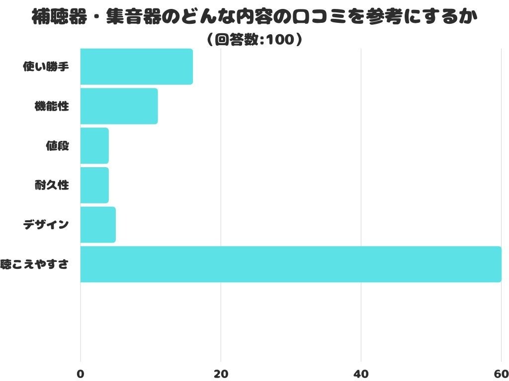 補聴器・集音器のどんな内容の口コミを参考にするかをアンケートにて調査したところ、1位は「聴こえやすさ」でした。
