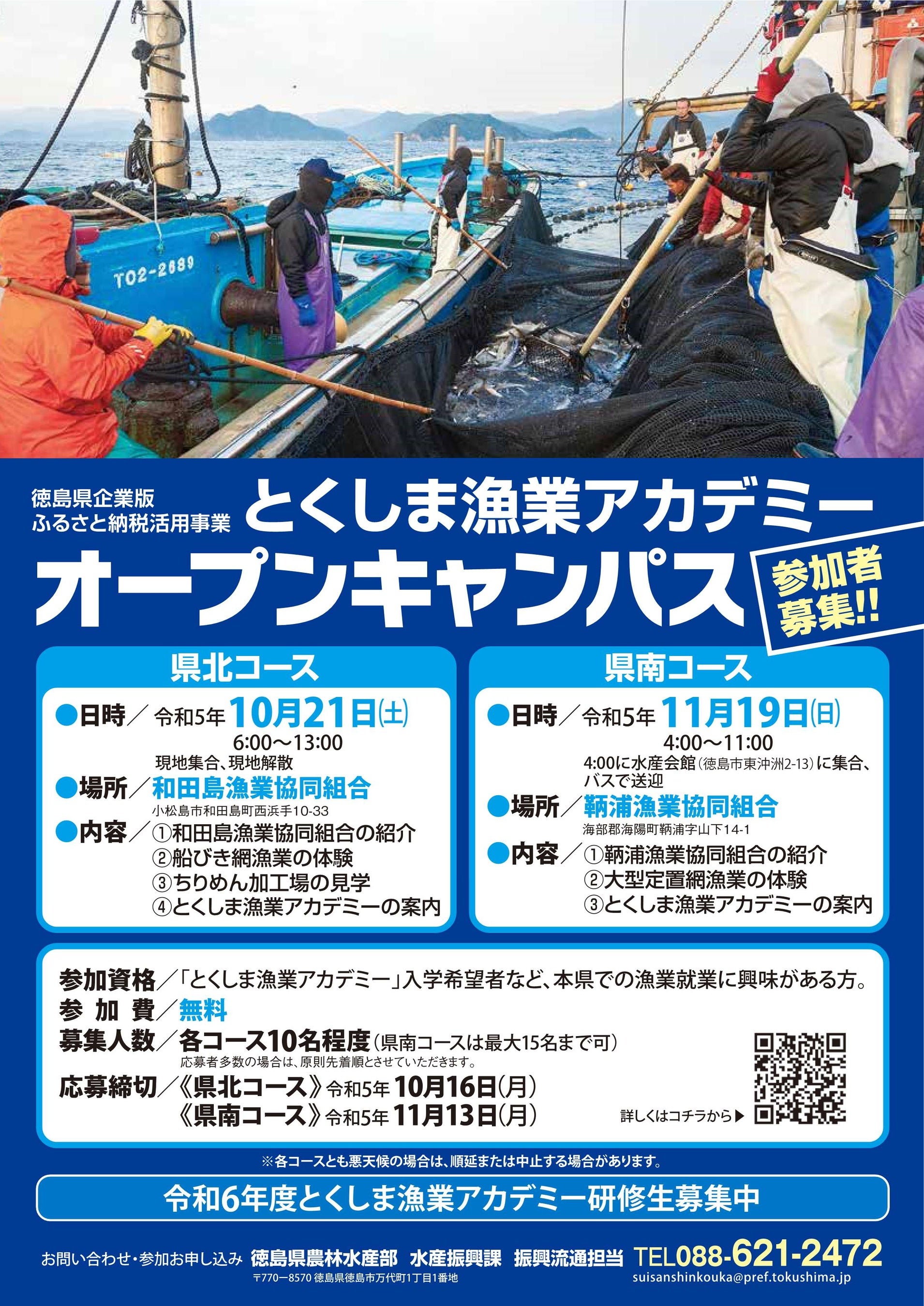 このたび、本県での漁業就業に興味のある方を対象に「とくしま漁業アカデミー」オープンキャンパスを開催し、次のとおり参加者を募集します。