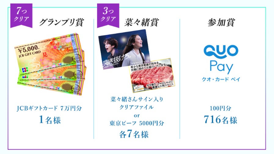 さらに7つのミッションをすべて正解された方の中から抽選で1名様にグランプリ賞としてJCBギフトカード「7」万円分を進呈します。
