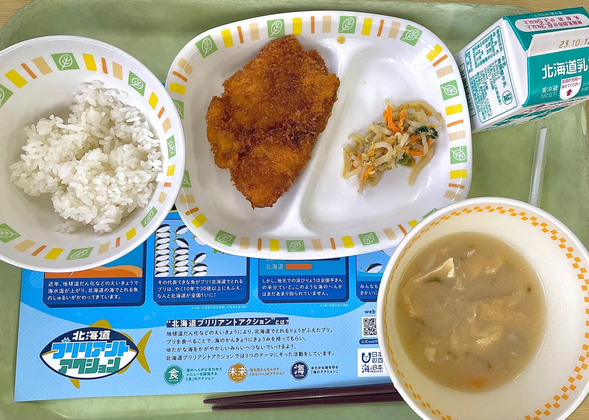 家庭の食卓でもブリたれカツを味わってもらうことができるよう、そのような下処理の方法や、他にも海洋環境の変化のマンガなどを記載したランチョンマットを給食配膳時に全児童生徒へと配布しました。