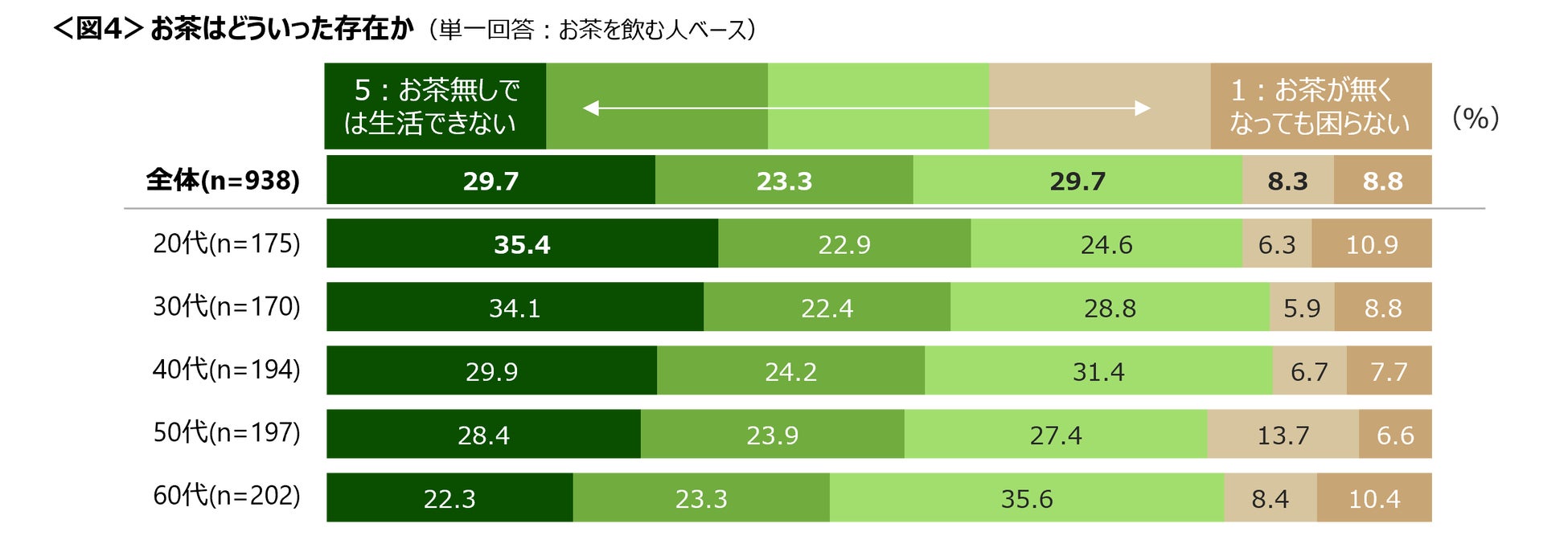 「お茶なしでは生活できない」と回答した人は約3割。そのうち最も多いのは20代で35.4%となった。<図4>