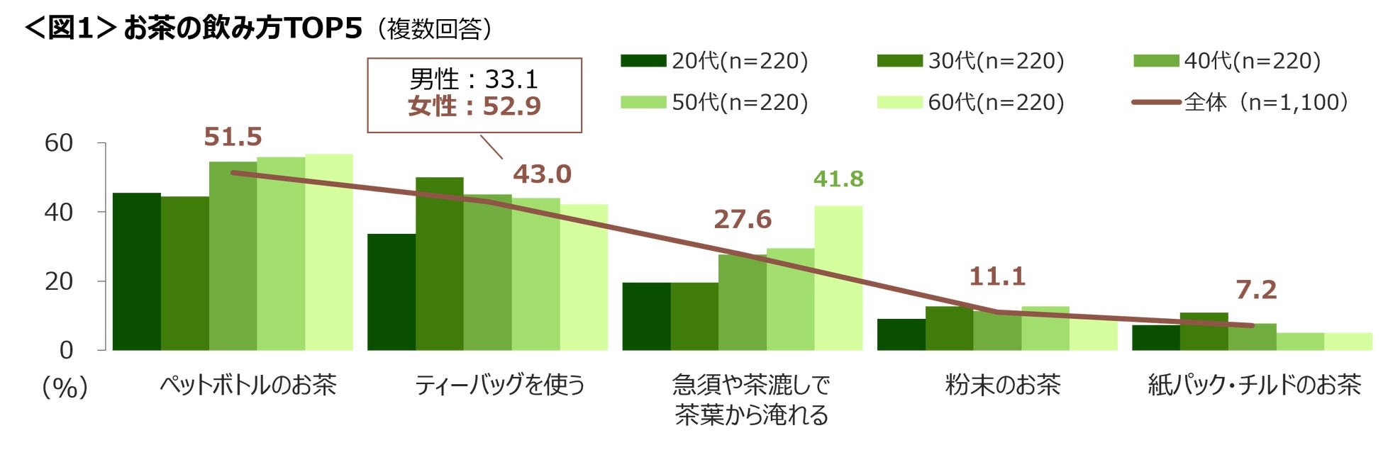 お茶の飲み方として、「ペットボトルのお茶」が51.5%でTOP。「ティーバッグを使う」が43.0%で続く。