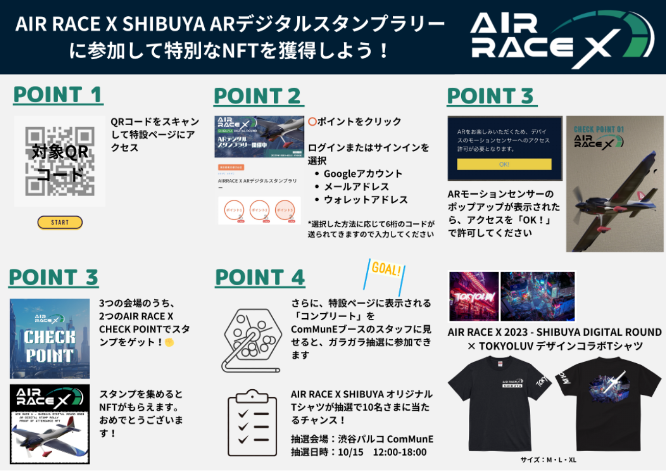 渋谷区内に設置された3か所のうち、2か所でデジタルスタンプを収集しクリアした参加者全員に、参加証明NFTをプレゼントします。さらに、抽選で限定の「AIR RACE X SHIBUYA ×TOKYOLUVデザインコラボTシャツ」を手に入れるチャンスもございます。