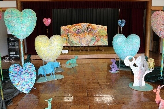 【清澄庭園内「大正記念館」】江東区内の4つの特別支援学校の子どもたちが学校単位で、マスキングテープで大きなハートのオブジェを制作しました。また、個人制作として、マスキングテープでハートをかたどった小さなハートのカードを展示します。アートパラの理念「共に生きる」社会の実現をめざして、区内の子どもたちにも芸術祭に参加していただいています。