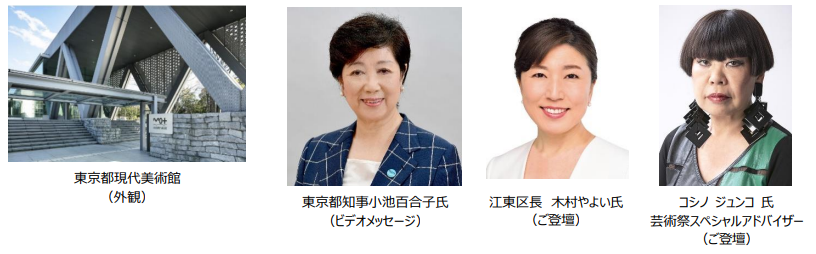 現代美術の聖地、東京都現代美術館にて芸術祭のスタートを飾るオープニングセレモニーを開催します。セレモニーには第1回(2020年)よりスペシャルアドバイザーとしてサポートいただいているコシノ ジュンコ氏をはじめ、江東区初の女性区長に選ばれた木村やよい氏にもご出席いただくほか、東京都知事の小池百合子氏からもビデオメッセージをいただきます。