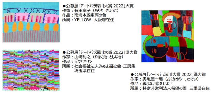 また、2022年の公募展の入賞作家の須田雄真(すだ ゆうま)さんによる100年続く芸術祭への祈願として富岡八幡宮へ奉納する大絵馬のお披露目や、スペシャルパフォーマンスとして、ダウン症の芸術家の隅野由子(すみの ゆうこ)さんによる芸術祭を表現する「書」をライブで書き下ろしていただきます。