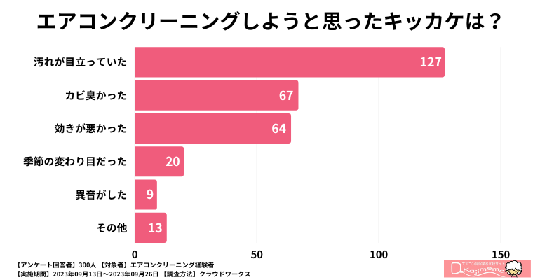 そして「カビ臭かった」の67人と「効きが悪かった」の64人が上位に入り、エアコンを利用したときの不快感がエアコンクリーニングの判断基準となっていることを伺わせます。特にカビの臭いは、健康への悪影響を懸念する人が多いため、上位の回答になったという可能性があります。