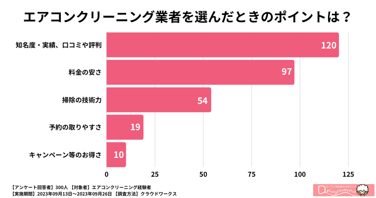 エアコンクリーニング業者を選んだときのポイントとして、トップに位置するのは「知名度・実績、口コミや評判」で、120人がこの基準を重要視しています。エアコンクリーニングの業者選びにおいて、信頼性や過去の成功事例が非常に大きなポイントになっているといえるでしょう。